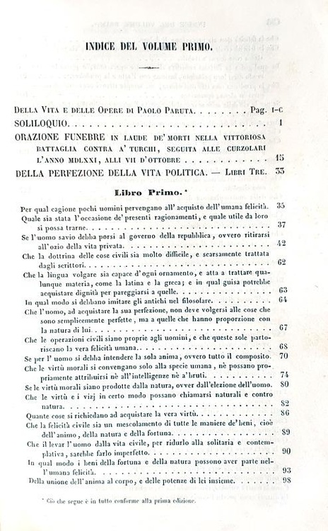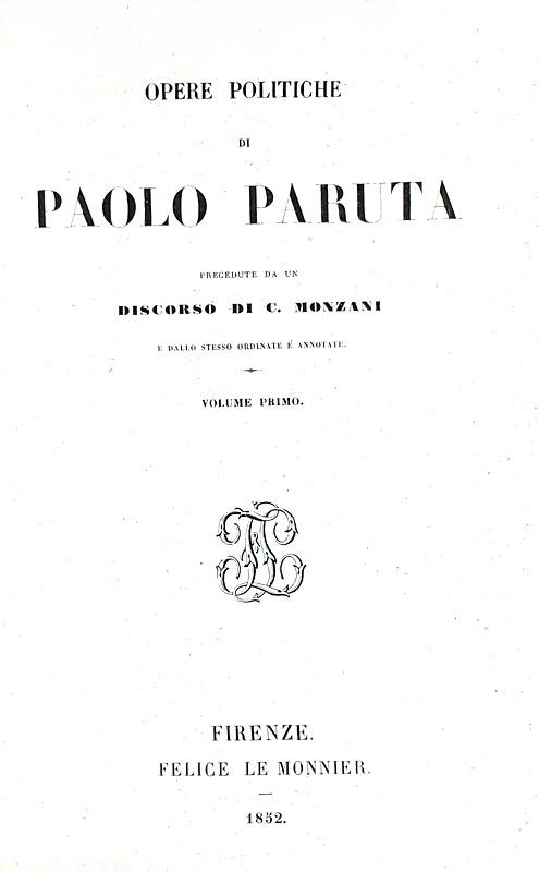 Due volumi di cm. 17,5, pp. (4) c, 460; pp. (4) 570. Bella legatura strettamente coeva in mezza pelle con titoli e ricchi fregi in oro al dorso; carta marmorizzata ai piatti. Sporadiche e lievi fioriture. Esemplare peraltro fresco e ben conservato. Paolo Paruta (1540-1598), storico e uomo politico veneziano, ricoprì le cariche di procuratore di San Marco, governatore di Brescia ed ambasciatore a Roma. Paruta fu autore di importanti opere politiche tra cui segnaliamo quelle presenti in questa edizione: Soliloquio; Orazione funebre per i morti alla battaglia contro i Turchi; Della perfezione della vita politica; Sopra la pace de' Veneziani co' Turchi; Lettera a gentiluomo veneziano; Discorsi politici. Scritti inediti: Discorso sulla neutralità; Dispacci alla Repubblica Veneta; Relazione all'Ambasciata di Roma. In testa all'edizione un'ampia introduzione bio-bibliografica sull'Autore. Cfr. Iccu.