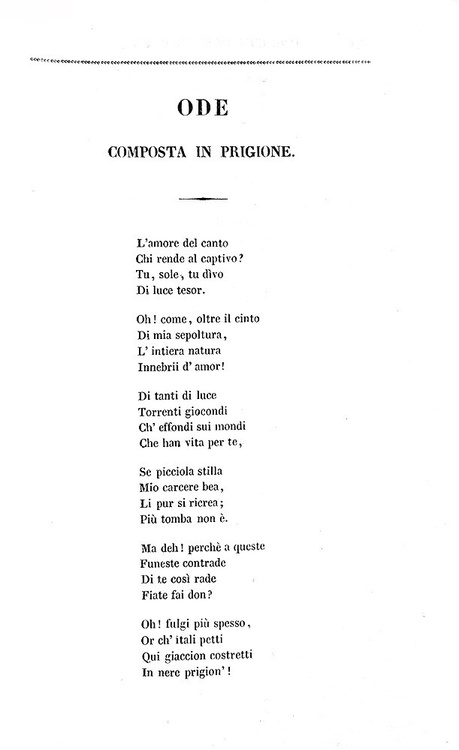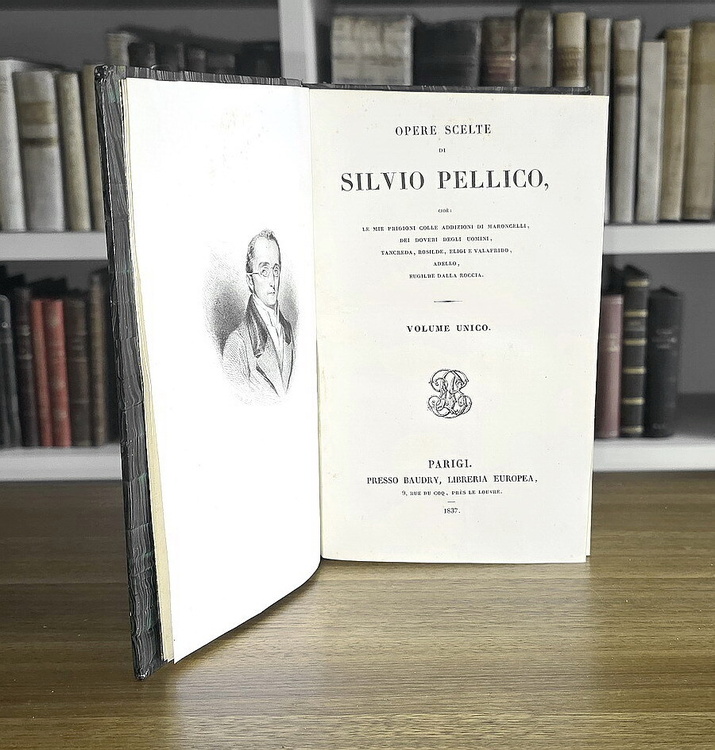 Cm. 21, pp. 478 (2). Bel ritratto di Pellico all'antiporta, finemente inciso in acciaio e protetto da velina. Bellissima legatura napoletana del tempo in mezza pelle verde con titoli e ricchi fregi in oro al dorso. Trascurabili segni del tempo, peraltro esemplare fresco e ottimamente conservato. Silvio Pellico (1789-1854), scrittore e patriota originario di Saluzzo, fu al centro della vita politica italiana. “Le mie prigioni”, celebre libro di memorie in cui Pellico descrisse la sua detenzione, si articola in un arco di tempo che va dal 13 Ottobre 1820, quando fu arrestato a Milano per l'adesione ai moti carbonari, al 17 Settembre 1830, giorno della scarcerazione. L'opera ebbe così tanta fortuna tanto da divenire il libro italiano più famoso e letto nell'Europa del tempo. Questa pregiata edizione parigina include le seguenti opere: Le mie prigioni; Alle mie prigioni addizioni di Maroncelli; Dei doveri degli uomini; Tancreda; Rosilde; Eligi e Valafrido; Adello; Eugilde dalla roccia; Ode composta in prigione. Cfr. Iccu.