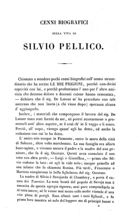 Opere scelte di Silvio Pellico, cioè: Le mie prigioni colle addizioni di Maroncelli, Dei doveri degli uomini, Tancreda, Rosilde, Eligi e Valafrido, Adello, Eugilde dalla roccia. Parigi, Baudry Libreria Europea, 1837.