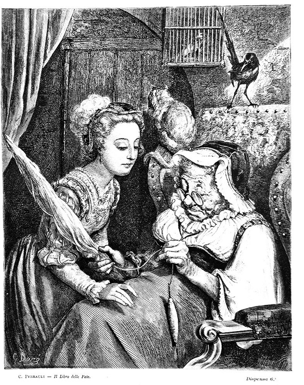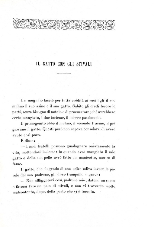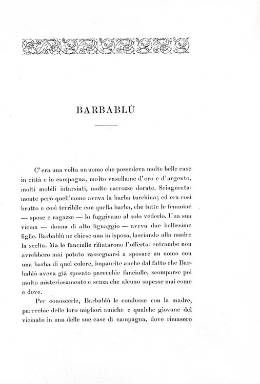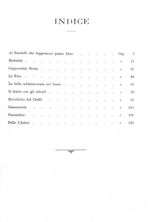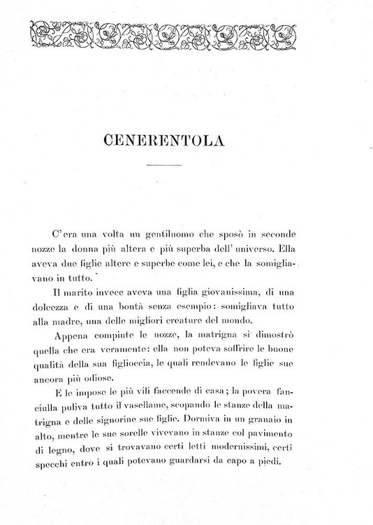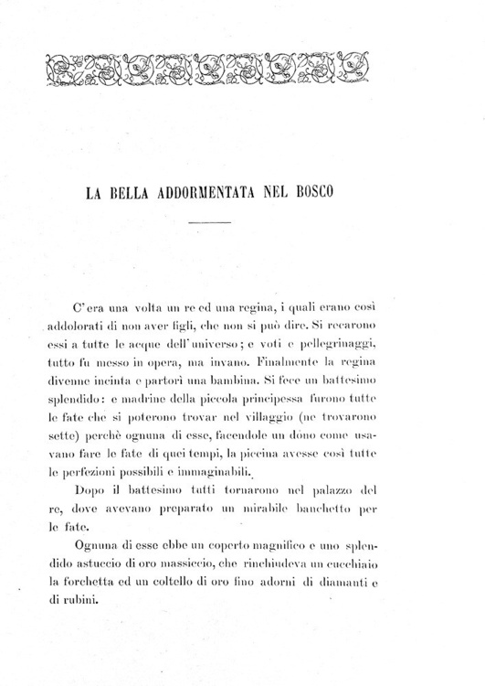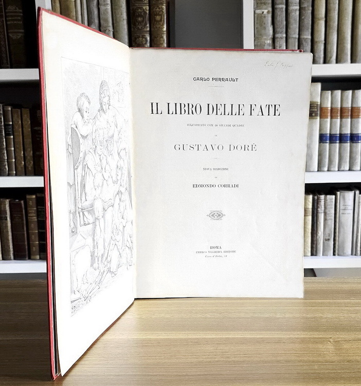 Cm. 33, pp. 189 (3). Con 40 splendide tavole xilografiche disegnate da Gustave Doré. Bella legatura editoriale in piena tela rossa con titoli in oro e motivi impressi a secco al dorso e al piatto anteriore. Piccola firma di possesso “Pietro G. Cappponi” all'angolo alto del frontespizio. Trascurabili segni del tempo. Ordinaria/inevitabile patina del tempo alle estremità delle pagine. Esemplare nel complesso fresco e ben conservato. Celebre raccolta delle fiabe di Charles Perrault (1628-1703), illustrate in quest'importante edizione milanese da Gustave Doré. Tra le fiabe menzioniamo: Cappuccetto rosso; Cenerentola, Enrichetto dal ciuffo; Il gatto con gli stivali; Pelle d'asino; Puccettino; Barbablù; La bella addormentata nel bosco. Non comune e sempre ricercato. Prima edizione di questa nuova traduzione (rispetto alle prime milanesi degli anni Ottanta) curata da Edmondo Corradi. Cfr. Iccu.