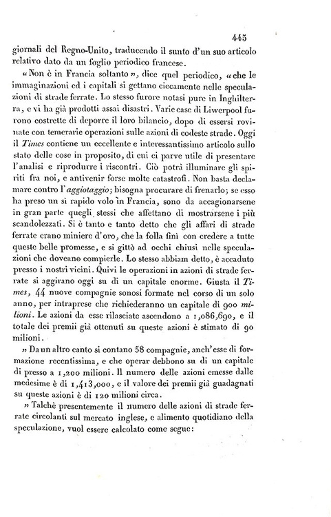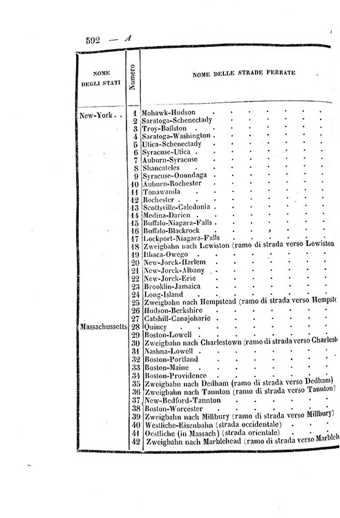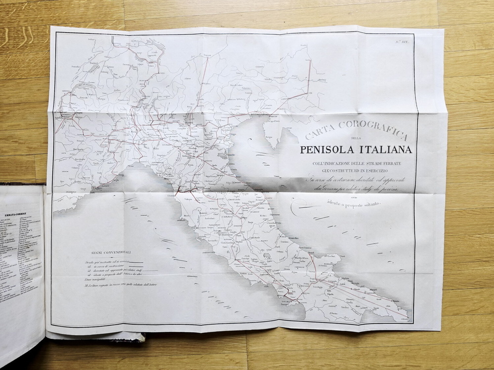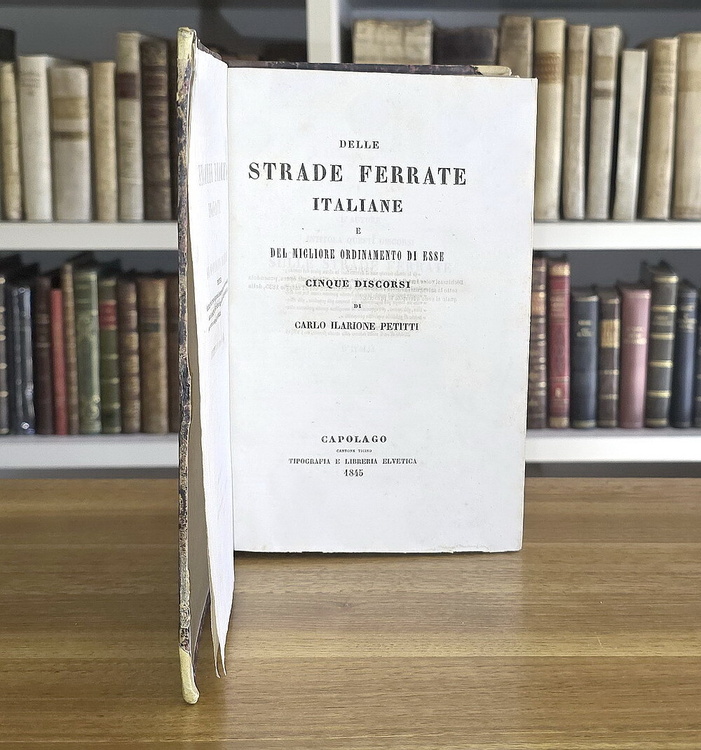 Cm. 22,5, pp. 652. Ripiegata in fine la grande cartina incisa su rame intitolata "Carta corografica della Penisola Italiana coll'indicazione delle Strade Ferrate già costruite ed in esercizio, in corso di costruzione, decretate ed approvate dai Governi per i relativi studj di perizia od ideate o proposte soltanto". Bella legatura strettamente coeva in mezza pelle con titoli, fregi e filetti in oro al dorso. Piatti in carta marmorizzata e piccole punte in pergamena. Trascurabili segni del tempo alla legatura e lievi/usuali fioriture, peraltro esemplare nel complesso fresco e ben conservato. Rara e ricercata prima edizione di questo volume del celebre statista ed economista piemontese Carlo Ilarione Petitti conte di Roreto (1790-1850), uno dei più rilevanti studi sulle ferrovie pubblicati in Italia nel corso dell'Ottocento. "His work on Italian railways, in which he studied the organisation of railways thorughly, giving many useful statistics, was of great importance in Italy, as a first example of this kind of investigation" (Palgrave). "Il conte Petitti, acceso e convinto sostenitore del progresso civile ed economico del Piemonte e ardente propugnatore delle costruzioni ferroviarie nelle quali vedeva uno strumento di unificazione nazionale, scrisse questa sua vasta opera probabilmente per suggerimento del Re" (Caddeo, Le edizioni di Capolago). Cfr. Iccu; Bibliografia ferroviaria italiana; Caddeo, nr. 379; Einaudi, III, A.631. L'opera è stata ripubblicata in Carlo Ilarione Petitti di Roreto, Opere scelte, a cura di Gian Mario Bravo, Torino, Fondazione Luigi Einaudi, 1969, II, pp. 7-598.