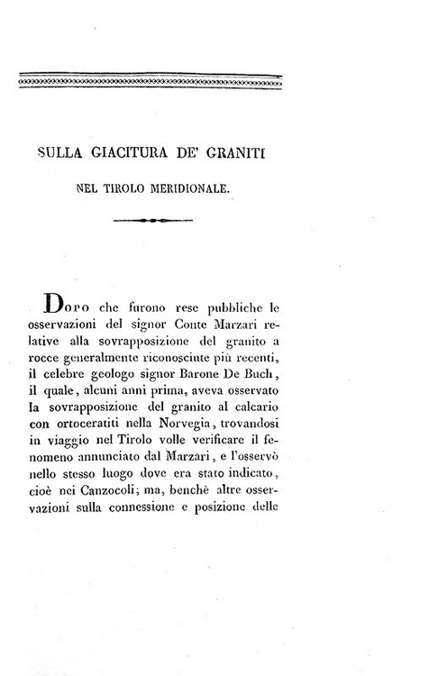 Sulle osservazioni fatte da alcuni celebri geologi posteriormente a quelle del sig. conte Marzari intorno alla giacitura de' graniti nel Tirolo meridionale. Memoria geognostica letta all'I. R. Istituto di Lombardia dal socio Scipione Breislak. Milano, dall'Imp. Regia Stamperia, 1824.