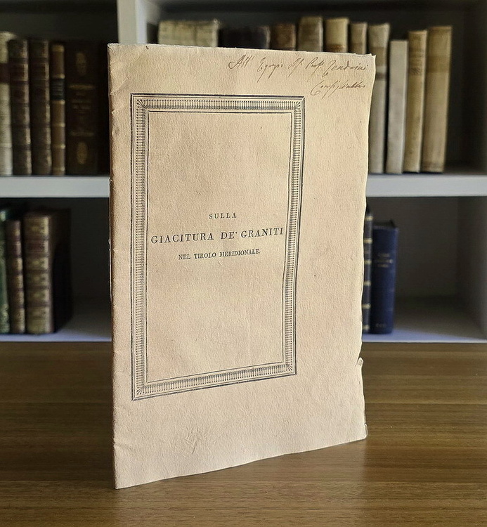 Cm. 25, pp. 22 + 1 c.b. Bella brossura originale ornata. Invio di mano coeva nella parte alta del piatto anteriore della brossura. Esemplare perfettamente conservato. Scipione Breislak (Roma 1750 - Milano 1826), geologo e naturalista di origini svedesi, studiò filosofia, teologia e divenne professore di matematica e fisica al collegio scolopio di Ragusa. Tornato a Roma, divenne docente di fisica al Collegio Nazareno, sempre tenuto dai padri scolopi e membro dell'Accademia degli Incolti. Con la sua collezione di minerali, creò il primo museo di minerali di Roma (tuttora esistente e visitabile). Nel frattempo approfondì i suoi interessi per la mineralogia, studiando i terreni vulcanici della Campania. Nei dintorni di Napoli ritrovò diversi cristalli e minerali di zolfo, dando ad uno di questi il proprio nome, la Breislakite. Nel 1798, dopo la caduta della Repubblica Romana a cui aveva partecipato attivamente, fuggì in Francia. Tornato in Italia nel 1802 entrò nell'amministrazione napoleonica come Ispettore delle polveri e dei salnitri. Negli anni seguenti condusse ricerche geologiche e mineralogiche in Lombardia. Il 18 novembre 1803 divenne socio dell'Accademia delle scienze di Torino. Dal 1815 fu tra i compilatori del periodico Biblioteca Italiana, sponsorizzato dal governo del Lombardo-Veneto. Il nome del genere del primo dinosauro italiano, lo Scipionyx samniticus, è un omaggio a Breislak. Il cratere lunare Breislak porta il suo nome. Interessantissimo saggio monografico dedicato alle formazioni granitiche presenti nel Tirolo meridionale, ovvero l'attuale Trentino. Rarissima prima edizione. Sbn-Iccu segnala pochissimi esemplari conservati nelle biblioteche pubbliche italiane.
