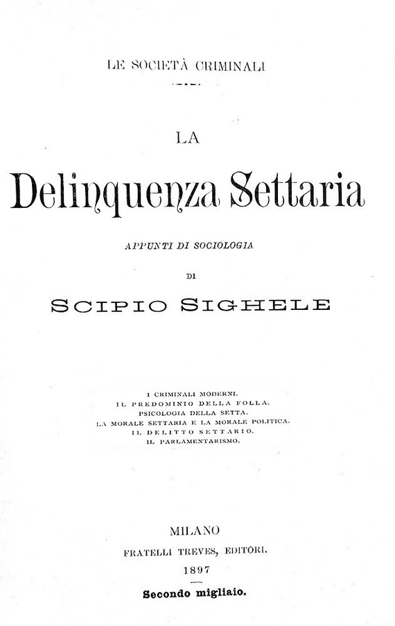 La delinquenza settaria. Appunti di sociologia. I criminali moderni. Il predominio della folla. Psicologia della setta. La morale settaria e la morale politica. Il delitto settario. Il parlamentarismo. Fratelli Treves editori, 1897.