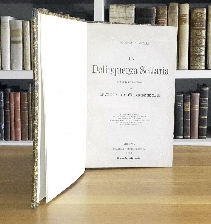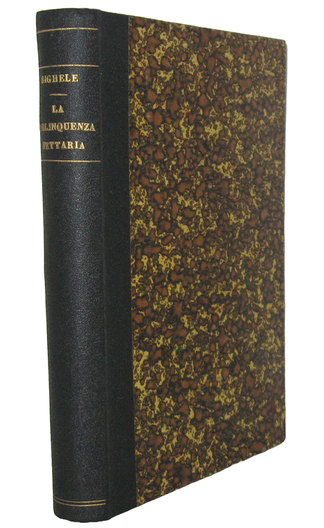 Cm. 18, pp. (6) 278 + 1 c.b. Ottima legatura coeva in mezza tela nera con titoli e filetti in oro al dorso; bella carta marmorizzata ai piatti. Lievi e naturali arrossature dovute alla qualità della carta. Esemplare nel complesso fresco e ben conservato. Scipio Sighele (1868-1913), seguace delle teorie lombrosiane, scrisse di psicologia collettiva e criminale. Insegno' a Roma, Pisa e Bruxelles; fu irredentista attivo in Trentino. Fu processato dall'autorità giudiziaria austriaca in due occasione e venne quindi espulso nel 1911. Interessante ed attuale saggio sulla dinamica psicologia della setta e dei delinquenti settari. L'Autore indaga i meccanismi interni alla folla, volendo dimostrare come nelle tendenze del collettivo sussistessero attitudini fondamentalmente criminose. Fu uno dei primi autori ad affrontare questo tipo di indagine e sottolineò inoltre come l'essere umano, inserito in un contesto di folla, perda il suo autocontrollo razionale lasciando entrare in gioco la sua natura crudele e i suoi istinti criminali. Rara prima edizione (secondo migliaio). Collana “Le società criminali”. Cfr. Iccu.