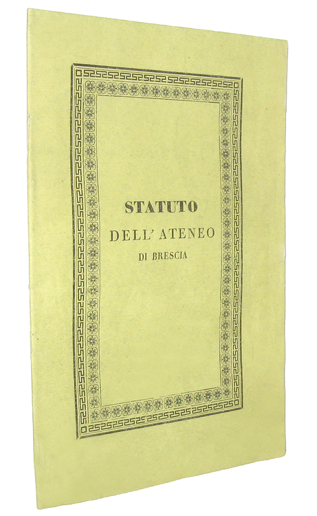 Cm. 21, pp. 16. Brossura originale ornata di colore giallo. Esemplare fresco e ottimamente conservato conservato. L'Ateneo di Brescia è la più antica istituzione culturale della città di Brescia. Fondata nel 1802 come evoluzione dell'Accademia di scienze, lettere, agricoltura ed arti del Dipartimento del Mella, fu voluta dalla Commissione di Istruzione Pubblica del Dipartimento del Mella. Un decreto napoleonico del 1810 determina che le istituzioni culturali che operano nelle varie città del regno siano unificate e prendano il titolo di ateneo. Dal 1811, anno in cui venne data esecuzione al citato decreto napoleonico, l'istituzione assunse il nome Ateneo di Brescia con l'aggiunta esemplificativa di Accademia di scienze, lettere ed arti, per sottolineare il legame col sodalizio già esistente. Questi statuti furono promulgati sotto la presidenza di Girolamo Monti il 26 Dicembre 1830. Così recita l'art. 1 delle disposizioni generali: “L'Ateneo di Brescia ha per iscopo di diffondere, principalmente nella provincia le scoperte e le cognizioni più utili in tutto ciò che si riferisce alle scienze, lettere, agricoltura ed arti”. Rara prima edizione dello statuto che regolava giuridicamente le attività dell'Università di Brescia. Cfr. Iccu che menziona solo pochi esemplari conservati nelle biblioteche pubbliche italiane.