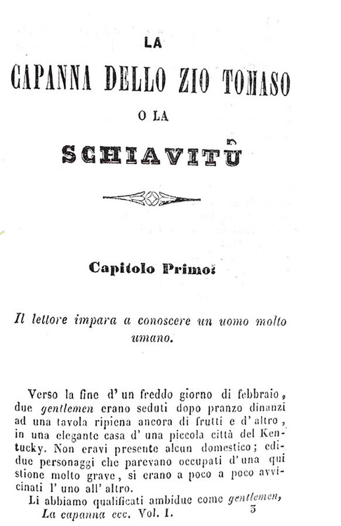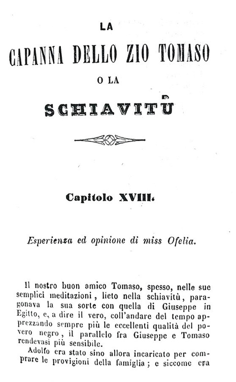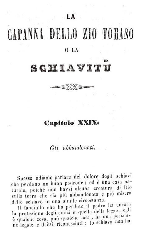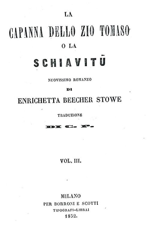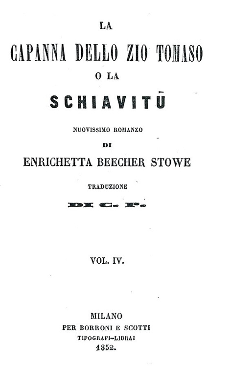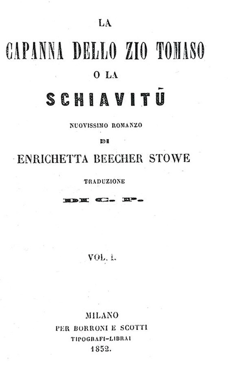 La capanna dello zio Tomaso, o la schiavitù. Nuovissimo romanzo. Milano, per Borroni e Scotti, 1852.