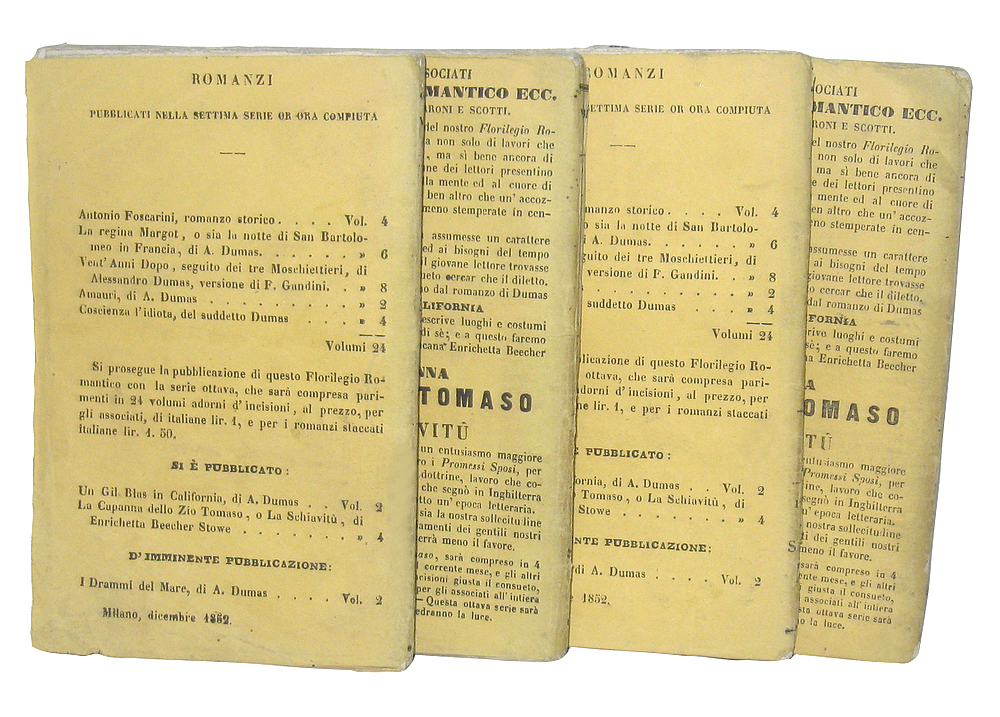 Quattro volumi di cm. 16, pp. 175 (1); 158 (2); 184; 205 (1). Con quattro antiporte xilografiche raffiguranti scene tratte dal romanzo. Etichetta pubblicitaria del tempo applicata al piatto anteriore del quarto volume. Rara brossura editoriale illustrata protetta da velina. Minime mende alle brossure. Esemplare nel complesso fresco e ben conservato. Harriet Beecher Stowe (1811-1896), celebre scrittrice statunitense, fu promotrice della causa abolizionista. La capanna dello zio Tom (Uncle Tom's cabin, 1852) ebbe un'immensa popolarità e contribuì a provocare la svolta antischiavista degli Stati Uniti e la guerra civile. Nell'anno successivo alla pubblicazione solo in patria si vendettero circa 300.000 copie. Verosimilmente prima edizione italiana (particolarmente rara da trovarsi nella sua brossura editoriale), uscita nello stesso anno dell'originale americano e seguita sempre nel 1852 da un'edizione torinese e a una fiorentina, entrambe prive di tavole. Cfr. Iccu.