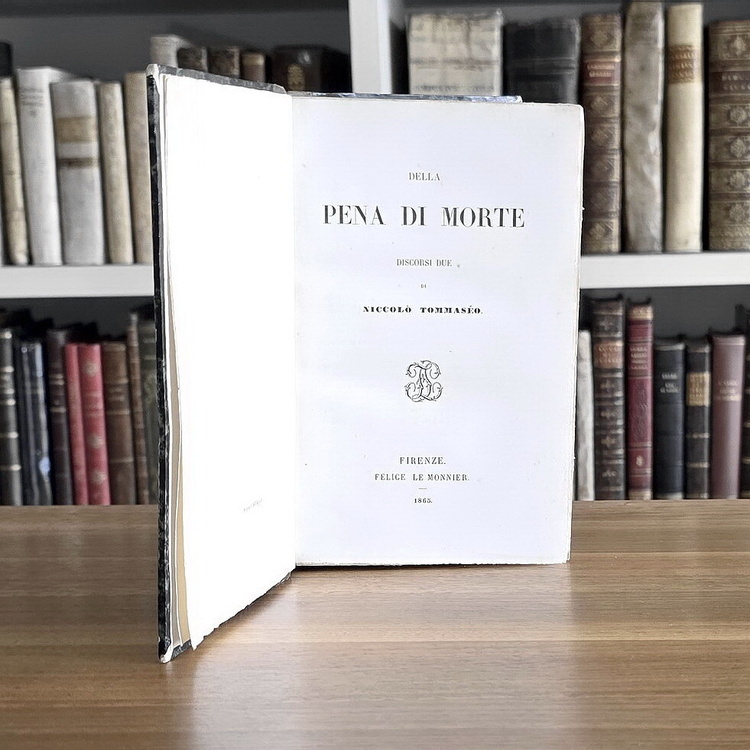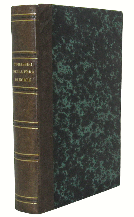 Cm. 18,5, pp. (4) 495 (1). Legatura coeva in mezza pelle con titoli e filetti in oro al dorso. Segnacolo in seta rossa. Lievi e sporadiche fioriture. Esemplare ben conservato. Non comune e ricercata prima edizione di questo corposo e significativo saggio, in cui il celebre scrittore e patriota dalmata Niccolò Tommaseo (1802-1874) tratta monograficamente il tema della pena di morte. Nell'opera “Della pena di morte, per Le Monnier (Firenze 1865), sviluppava le posizioni di Dell'Italia mostrando come fosse linguisticamente – e dunque moralmente – sbagliato parlare di un «diritto di punire»” (cfr. la voce T. curata da Gabriele Scalessa in Dizionario Biografico degli Italiani, volume 96, 2019). Cfr. anche Viola, Bibliografia della pena di morte, p. 67: “Discute l'argomento colla scorta della filosofia della storia”; Raineri Biscia, 406; Tecchia-Poletti, p. 84; Biancardi-Francese, Prime edizioni italiane, p. 432; Iccu.