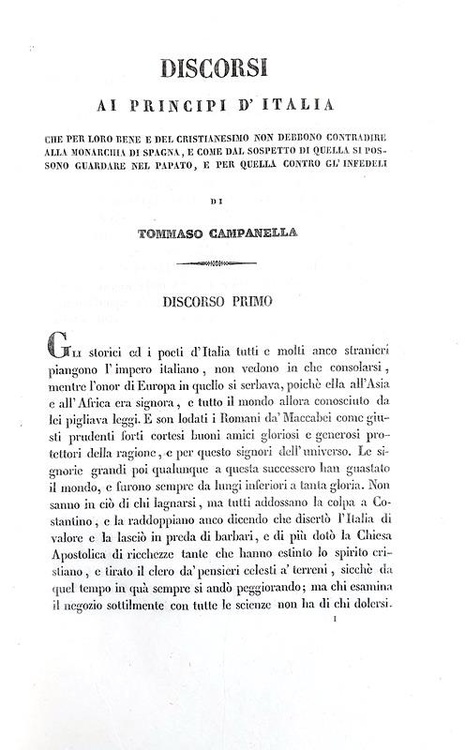Cm. 28, pp. vii (1) 37 (1) + 1 c.b. Legatura coeva in cartonato rigido editoriale ornato. Esemplare marginoso e in stato di conservazione praticamente perfetto. Quest'opera, composta nel 1594, fu tramandata in due codici manoscritti conservati nella Biblioteca Reale di Parigi e nella Brancacciana di Napoli. Rimasta inedita per circa 250 anni, fu pubblicata da Paolo Garzilli, prefetto della Brancacciana. La pubblicazione non fu affatto casuale ma s'inserisce nel clima di speranza suscitato dalle azioni di Pio IX e di fatto rappresenta un esempio delle istanze risorgimentali che animavano il Mezzogiorno in quegli anni. Campanella, difensore della monarchia spagnola, in questo testo elaborò una formula politica per l'Italia attraverso un'esortazione a tutti i principi invitati a riunirsi in una struttura federale capeggiata dal papa. Prima edizione postuma. Cfr. Iccu.