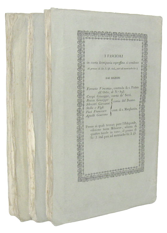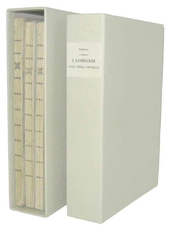 Tre volumi di cm. 22,5 [con 3 occhietti e tre frontespizi], pp. (8) 143 (1); 152 (2); 162 (2) di errata. Brossura editoriale. Sporadiche e naturali fioriture. Ottimo esemplare a pieni margini conservato entro cofanetto realizzato su misura. Prima edizione di questo celebre poema storico in ottave che avrebbe voluto costituire la risposta di gusto romantico al classicismo di Torquato Tasso. Dal poema, pubblicato in tre fascicoli molto apprezzati dal pubblico fin dalla prima uscita, fu ricavato da Temistocle Solera il libretto per la celebre opera lirica di Giuseppe Verdi, rappresentata alla Scala l'11 febbraio 1843. Una nuova versione, in francese, intitolata Jérusalem andò in scena nel 1847. Tommaso Grossi (1790-1853) fu uno dei maggiori letterati lombardi della prima metà dell'Ottocento; originario di Bellano (Lecco sul Lago di Como) fu molto amico di Alessandro Manzoni e di Carlo Porta. Manzoni, nel capitolo XI dei "Promessi Sposi", inserì un verso dell'ancora inedito poema di Grossi, senza menzionare il nome dell'autore, ma presagendo ‘un bel rumore' quando l'opera fosse uscita. Cfr. Iccu; Vismara, Bibliografia di Grossi, p. 24: "Di questa prima edizione si fece una tiratura di 3500 copie"; Parenti, Prime edizioni italiane, 279; Cat. Hoepli, 187; Cat. Meneghina, 1455; Iccu.