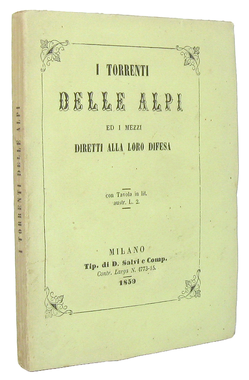 Cm. 15,5, pp. 196. Con una tavola grande litografica ripiegata f.t. raffigurante 15 figure (comuni di Villard Eymond e D'Auris nelle Alpi francesi). Brossura editoriale ornata di colore giallo chiaro. Esemplare perfettamente conservato. Interessantissimo trattato di carattere tecnico-scientifico dedicato alla corretta gestione dei torrenti alpini: argini, controllo del disboscamento, scavi, dighe, chiuse, manutenzione, alluvioni, ecc. Rarissima prima edizione italiana, traduzione di un testo francese di Joseph Scipion Gras (1806-1873). Non si riscontrano ‘passaggi' nel mercato antiquario. Tre soli esemplari censiti in Iccu.