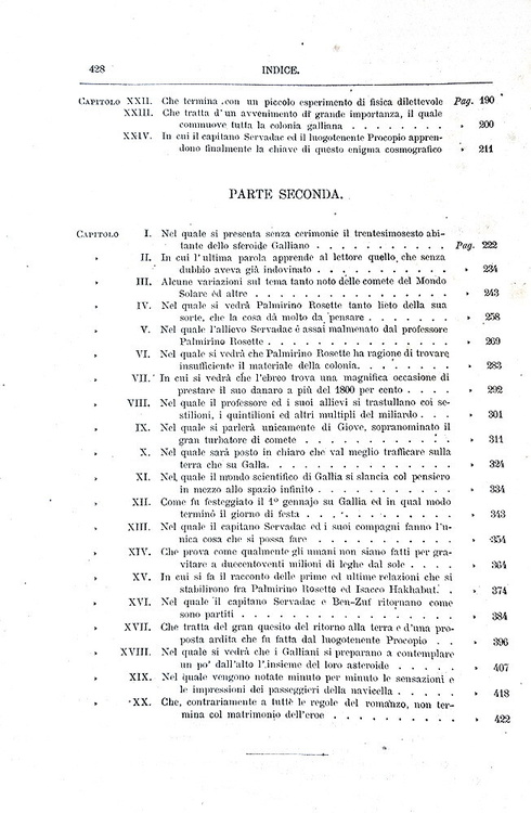 Cm. 25,5, pp. 428. Con numerose belle illustrazioni xilografiche n.t. (anche a piena pagina). Conservati all'interno entrambi i piatti della rara brossura editoriale di colore rosa. Legatura strettamente coeva in mezza pelle con titoli e filetti in oro al dorso. Trascurabili segni del tempo alla legatura. Sporadiche e trascurabili fioriture, peraltro esemplare nel complesso genuino e ben conservato. Non comune seconda edizione italiana (editio princeps francese risale al 1877) di questocelebre romanzo di fantascienza verniano. Una cometa sfiora la terra portandosi via una parte dell'Algeria insieme a una quarantina di persone di varie nazioni ed età, costrette a viaggiare per due anni attraverso il sistema solare e a formare così una microsocietà, finché la cometa non torna in prossimità della terra, consentendo il loro ritorno. Cfr. Iccu.