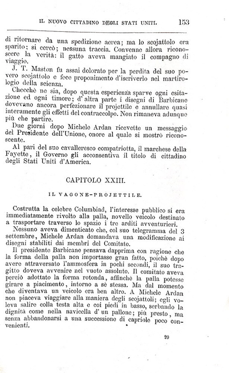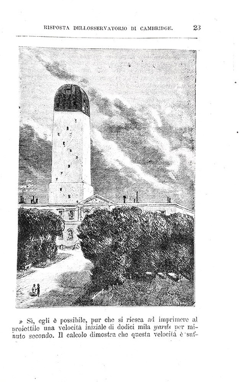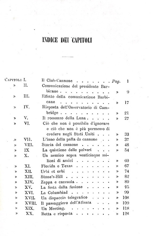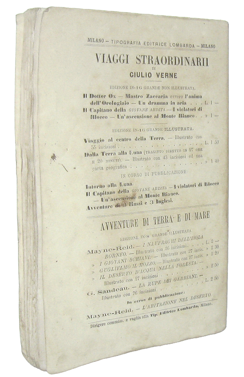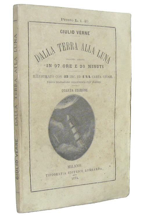 Cm. 19,5, pp. (4) 187 (5). Con 43 belle incisioni xilografiche n.t. (inclusa l'antiporta). Il frontespizio annuncia la presenza di una carta geografica, il ns. esemplare (come tutti gli altri verificati) presenta la cartina della Florida n.t. a p. 70. Brossura editoriale (molto rara da trovarsi integra). Trascurabili segni del tempo e qualche sporadica/lieve arrossatura. Esemplare nel complesso ben conservato. Questa celebre opera (titolo originale: De la Terre à la Lune, 1865) è un romanzo scientifico avventuroso (precursore della fantascienza ) di Jules Verne in cui si narra di un viaggio sulla luna. Unica traduzione italiana autorizzata dall'Autore. Rara edizione stampata due anni dopo la prima traduzione italiana, peraltro non autorizzata. Cfr. Iccu.