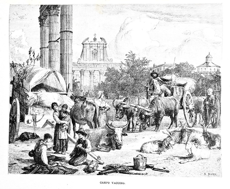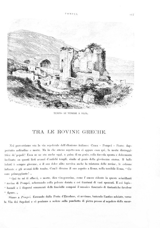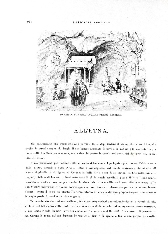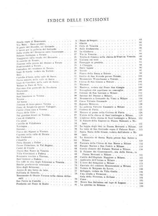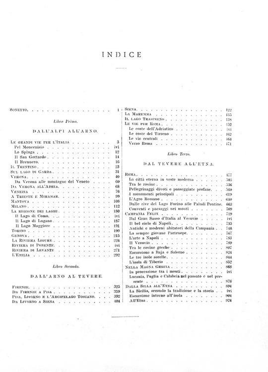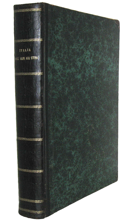 Cm. 38, pp. (2) 938. Con 930 splendide illustrazioni xilografiche anche a piena pagina raffiguranti paesaggi, città, palazzi, piazze italiane di A. Schloss, G. Bauernfeind, Germann Bohn, Arthur Calame, G. Closs, L. Dill, Bh. Fiedler, Johannes Graf, L. Heilbuth, A. Hertel, E. Kanoldt, H. Kaulbach, W. v. Kaulbach, F. Keller, E. Kirchner, Lindemann Frommel, A. Metzener, L. Passini, P. F. Peters, W. Riefstahl, R. Schick, G. Schoenleber, F. Skarbina, Th. Weber, A. von Werner, etc. Legatura strettamente coeva in mezza pelle con titoli e filetti in oro al dorso; carta marmorizzata ai piatti e piccole punte in tela. Legatura leggermente allentata e con qualche fisiologico segno del tempo dovuto al gran peso del volume. Ordinarie e lievi arrosature, tipiche delle edizioni Treves dell'epoca. Esemplare nel complesso genuino e in buono stato di conservazione. Questa importante opera, uno dei più conosciuti resoconti di viaggio tedeschi dell'Ottocento, è divisa in tre parti scritte singolarmente dai tre autori: Dall'Alpi all'Arno (le grandi vie per l'Italia, dal Trentino all'Emilia) - Dall'Arno al Tevere (da Firenze alle vie per Roma) - Dal Tevere all'Etna (Roma, Campania Felix, nella Magna Grecia, dalla Silla all'Etna). Opera non comune e sempre ricercata (terza edizione italiana, la prima fu stampata sempre da Treves nel 1876). Cfr. Iccu; Cremonini, 209; Fossati Bellani, 582.