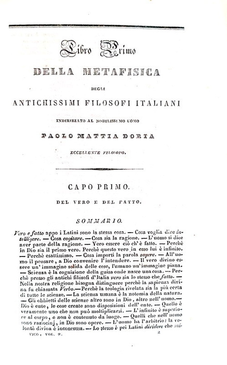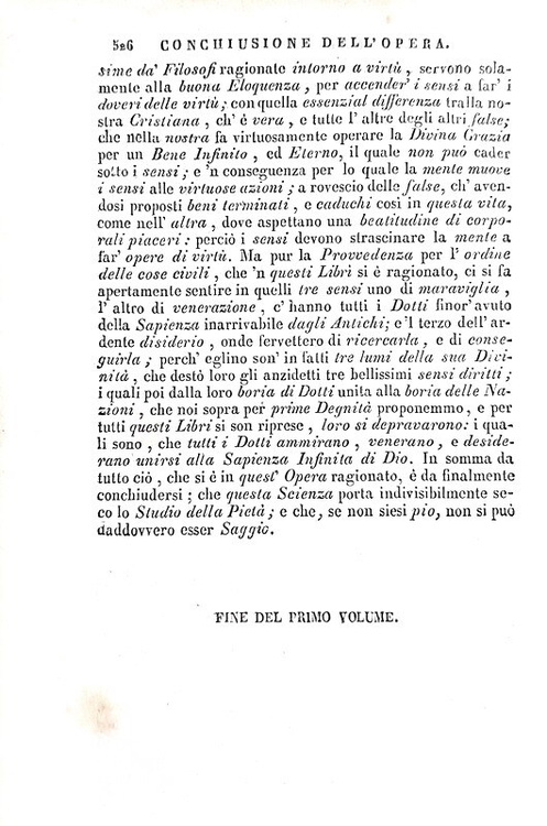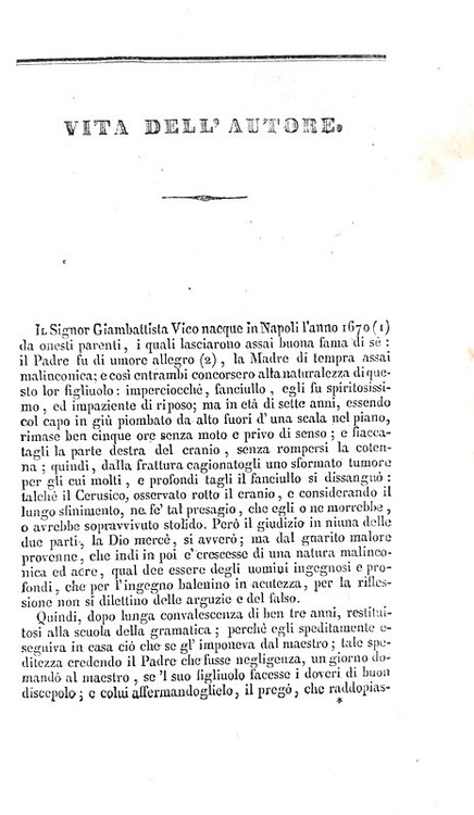 Due volumi di cm. 17, pp. xvi, 531 (1); 443 (1). Con quattro tavole fuori testo (ritratto, antiporta allegorica, grande tavola cronologica più volte ripiegata e l'ultima in fine al secondo volume). Graziosa legatura del tempo in mezza pelle con titoli e ricchi fregi in oro al dorso. Sporadiche e naturali fioriture dovute alla qualità della carta. Esemplare ben conservato. L'edizione include: discorso introduttivo e biografia dell'Autore; Principi di scienza nuova (Dello stabilimento de' principi, Della sapienza poetica, Della discoverta del vero Omero, Del corso che fanno le nazioni, Del ricorso delle cose umane); Della metafisica; Lettere dell'Autore; Elogi in morte di donne illustri; Prose varie; Poesie varie e note critiche. Edizione non comune. Cfr. Iccu.
