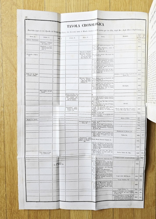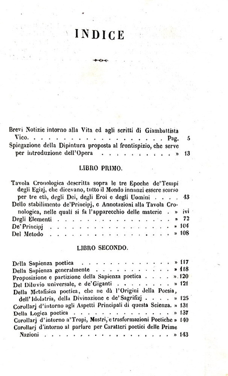 Cm 18,5, pp. 440. Con 3 tavole fuori testo: ritratto di Vico inciso all'antiporta, un'incisione allegorica con simboli massonici ed una tavola cronologica ripiegata f.t. Legatura strettamente coeva in mezza pelle con titoli e filetti ornati in oro al dorso. Trascurabili segni del tempo alla legatura, sporadiche e naturali fioriture. Esemplare nel complesso geniono e ben conservato. La Scienza nuova (o Principj di una scienza nuova) è l'opera principale del grande filosofo napoletano Giambattista Vico (1668-1744). Il trattato fu pubblicato per la prima volta nel 1725, inizialmente con scarso successo; in seguito, invece, ha iniziato ad essere molto apprezzato e influente nella filosofia della storia, nella sociologia e nell'antropologia. I concetti centrali, molto originali, per alcuni aspetti prefigurano l'illuminismo. Cfr. Iccu.
