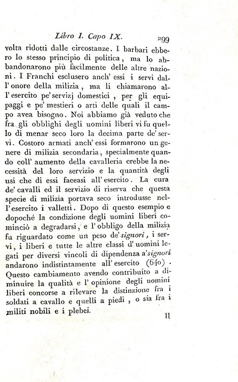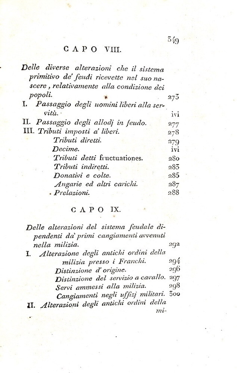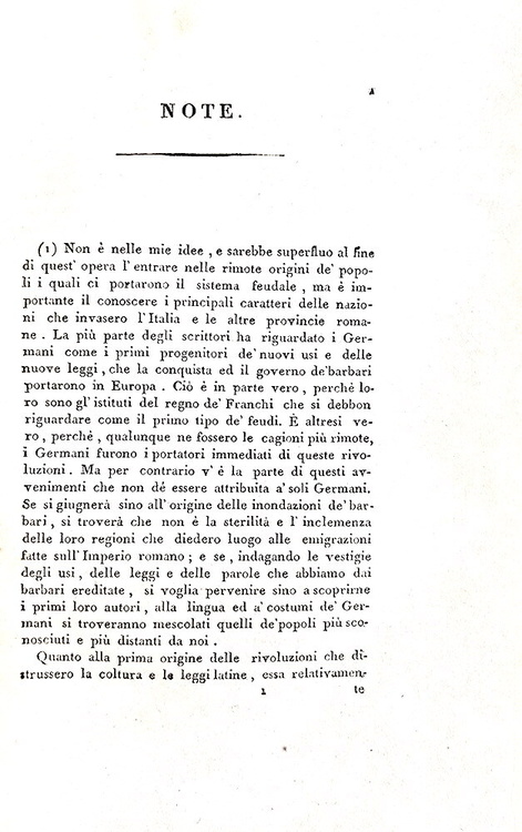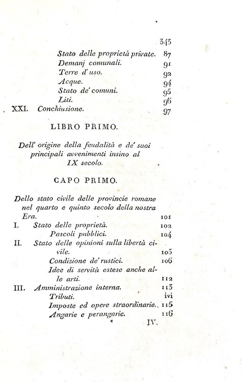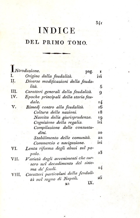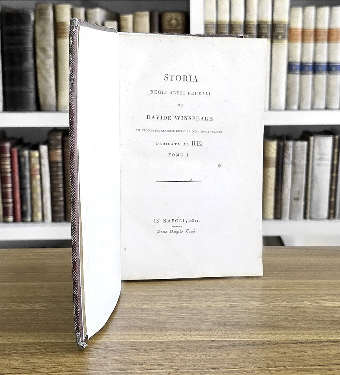 Cm. 22, pp xv (1), 321 (1); 350 [tomo primo, unico pubblicato, diviso in due parti, la seconda delle quali raccoglie le note]. Con una medaglia incisa all'acquaforte da G. Morghen (recto e verso) a pagina III raffigurante il generale Gioacchino Murat, re di Napoli. Bella legatura coeva in mezza pelle con titoli, impressioni a secco e ricchi fregi in oro al dorso. Lievi tracce d'uso. Sporadiche macchiette e leggera patina di ossidazione dovuta alla qualità della carta napoletana del tempo (ossidazioni più marcate in alcune carte). Esemplare nel complesso genuino e in buono stato di conservazione. David Winspeare (1775-1847), giurista e filosofo campano, fu nominato da Gioacchino Murat nel 1808 procuratore generale della Commissione feudale. Quest'importante opera si riferisce a quest'esperienza che portò in meno di tre anni alla risoluzione di numerose dispute aventi oggetto il riconoscimento dei diritti feudali. Il sistema feudale per Winspeare era «semplicemente come un “un mostro”, uscito dalle foreste dei barbari ed allevato dalla ignoranza e dagli errori di tredici secoli», che fu superato solo con l'avvento dell'Illuminismo. In appendice l'ampio saggio di Fustel De Coulanges (1830-1889) “Le origini del regime feudale”. Rara e ricercata prima edizione (la seconda fu stampata nel 1883, sempre a Napoli). Cfr. Iccu.