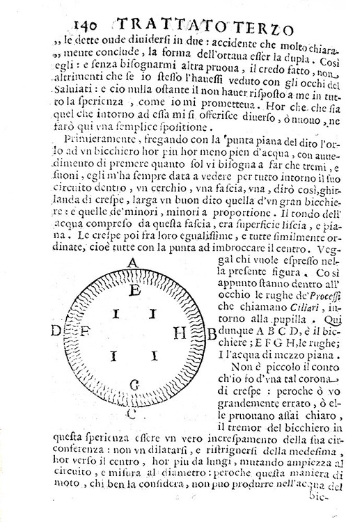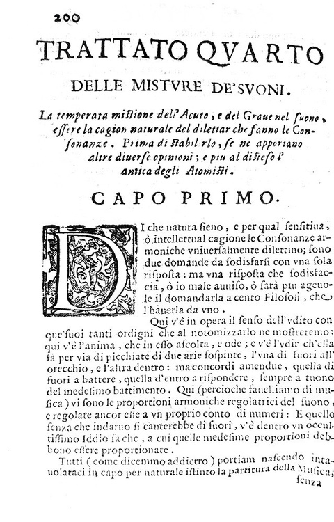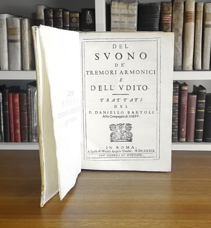 Cm. 20, pp. (16) 330 (2). Con 21 illustrazioni xilografiche n.t.; bei finalini e graziosi capilettera. Legatura coeva in pergamena rigida; tagli spruzzati. Abile restauro al dorso. Esemplare fresco e ben conservato. Daniello Bartoli (1608-1685), storiografo dell'ordine dei Gesuiti nativo di Ferrara, si dedicò con autorevolezza anche agli studi scientifici e matematici. In questo importante trattato dedicato ai meccanismi di trasmissione del suono in natura e in musica, l'A. descrive i fenomeni fisici e gli aspetti psicologici legati alla percezione delle diverse tipologie di suono, donando per la prima volta alla musica il ruolo di scienza fisica autonoma e non subalterna alla matematica e alla geometria. L'opera è suddivisa in quattro distinti trattati: “Del somigliante diffondersi che fanno in certi lor movimenti l'aria e l'acqua”; “De' movimenti del suono”; “Del tremore armonico”; “Delle misture de' suoni”. Rarissima prima edizione. Cfr. Iccu; Wellcome, II, p. 109; Gamba, 1775; Olschki, Choix, 6068.