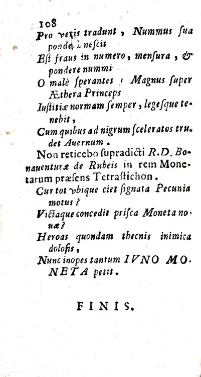 Cm. 14, pp. 108. Bel marchio tipografico al frontespizio e alcuni graziosi capilettera, testatine e finalini xilografici. Ottima legatura coeva in piena pergamena molle con titoli manoscritti al dorso. Macchietta e due piccoli buchetti all'ultima carta, sporadiche e trascurabili macchiette. Esemplare nel complesso genuino e ben conservato. Lodovico Calvi, giureconsulto bolognese attivo nella seconda metà del Seicento, fu autore di autorevoli pareri legali. Questa breve dissertazione di economia monetaria analizza, attraverso l'esegesi delle fonti storiche, le variazioni di valore e i rapporti tra le diverse monete antiche d'oro e d'argento. Rara prima edizione. Cfr. Iccu; non censito nel Catalogo Einaudi.