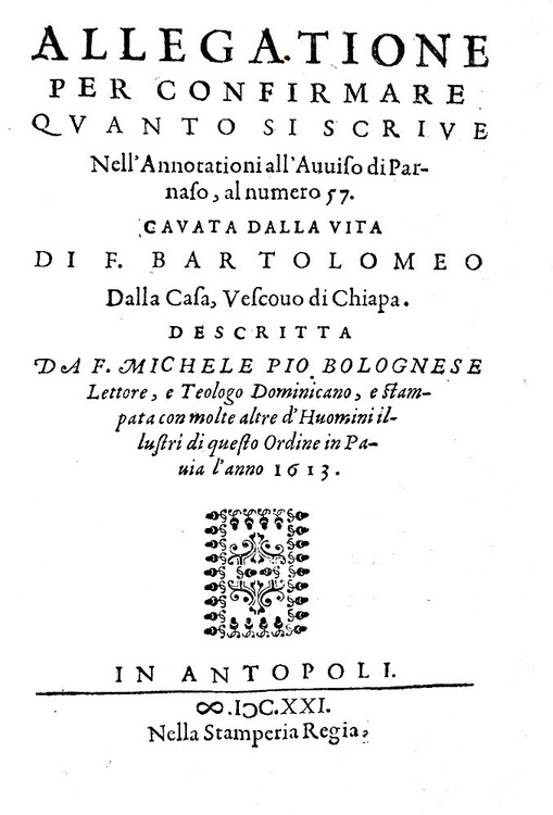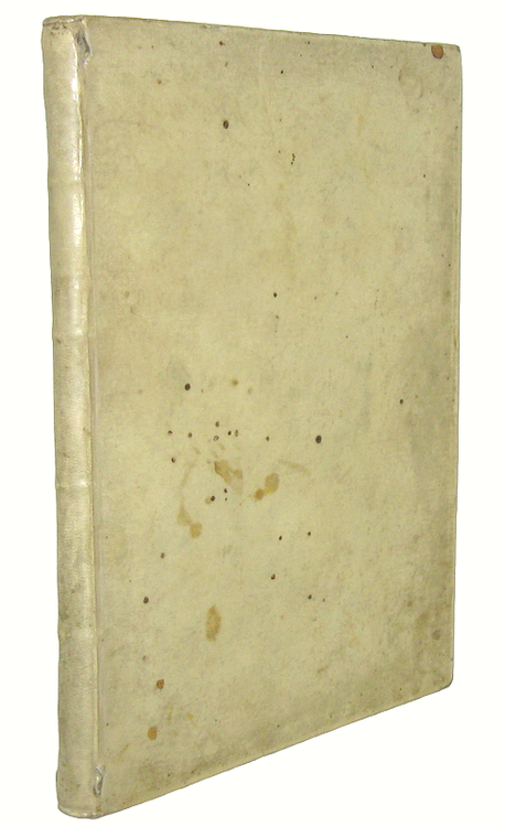 Pp. 60. Unito a: (CASTELLANI GIACOMO). Castigo essemplare de' calunniatori. Avviso di Parnaso. In Antopoli (Antibes), nella Stamperia Regia, 1621. Pp. 20. Unito a: PIO GIOVANNI MICHELE. Allegatione per confirmare quanto di scrive nell'Annotationi all'Avviso di Parnaso, al numero 57. In Antopoli (Antibes), nella Stamperia Regia, 1621. Pp. 22. Tre distinte opere rilegate in un solo volume di cm. 19. Bella legatura strettamente coeva in piena pergamena rigida. Esemplare ottimamente conservato. Nonostante Brunet (Manuel, I, 75) ritenga che l'Avviso di Parnaso sia il primo libro stampato a Antibes, la più recente bibliografia ritiene che il luogo di stampa "Antopoli" sia immaginario (cfr. Parenti, Luoghi di stampa falsi, p. 26. Pubblicato a Venezia o a Torino secondo Le edizioni veneziane del Seicento. Censimento, v. 1, p. 188, n. 720). L'Autore dei primi due testi (e probabile curatore del terzo) indicato con lo pseudonimo di Valerio Fulvio è Giacomo Castellani (cfr. Melzi, Dizionario di opere anonime e pseudonime, v. 1, p. 106 e 433); essi sono violentemente antispagnoli e pieni di attacchi sarcastici. L'intento del Castellani era quello di mettere in guardia gli stati italiani da qualsiasi alleanza con la Spagna, di cui evidenziava al brutale tirannia soprattutto per quanto concerne la conquista del Nuovo Mondo. L'avvertimento era rivolto soprattutto a Venezia che, spaventata dall'espansione turca in oriente, cercava una alternativa al rifornimento delle spezie verso Occidente, e al Ducato di Savoia oggetto delle mire egemoniche del Re di Spagna. L'Allegatione tratta della colonizzazione spagnola nel Messico, America Centrale, Perù, Hispaniola sin dal tempo della scoperta di Cristoforo Colombo, evidenziando le atrocità commesse nei confronti delle popolazioni locali ("Dodeci milioni d'Indiani morti da Spagnuoli"); vi si denuncia pure l'efferatezza e il saccheggio perpetuato degli Inglesi nelle Antille. La fonte primaria per gli eventi americani è la relazione di Bartolomeo de las Casas (pubblicata a Siviglia nel 1552). Le tre rare opere sono tutte in prima edizione. Cfr. Olschki, Catalogue of rare and valuable books relating to America, LIX; Olschki, Choix, 847"Ouvrage fort important pour l'histoire du domain espagnol en Amérique" ; Melzi, I, 433; Cicogna, 891-93; Lozzi, 6199, 6202; Piantanida 362; Parenti, Luoghi falsi, p. 26; Brunet, Dict. de Géogr., 75; Palau, XIII/n. 227133 (per il testo di Michele Pio); Rossotto, Scrittori Piemontesi, p. 546 "Valerius Fulvius sabaudus ... hic nomen est fictum".