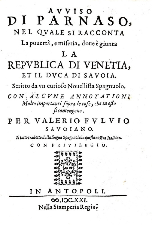 Avviso di Parnaso nel quale si racconta la povertà e la miseria, dove è giunta la Republica di Venetia et il duca di Savoia. In Antopoli (Antibes), nella Stamperia Regia, 1621.