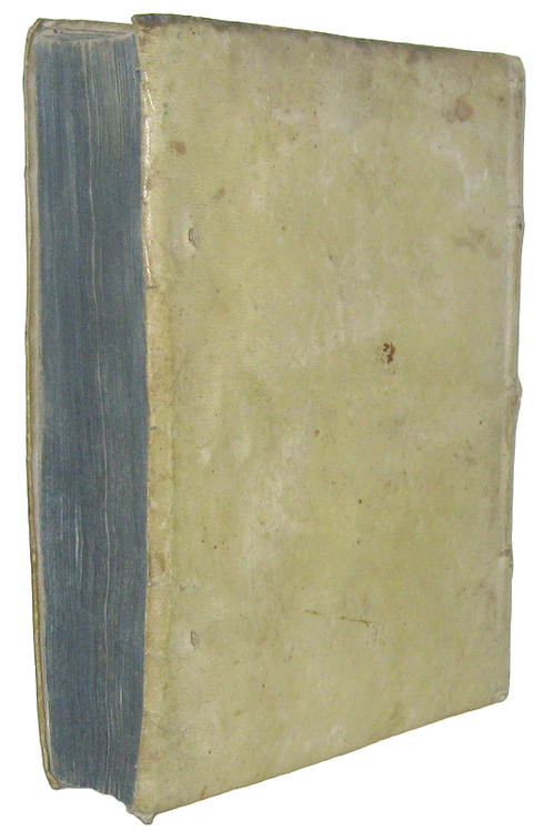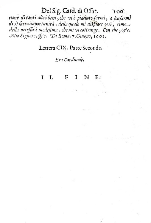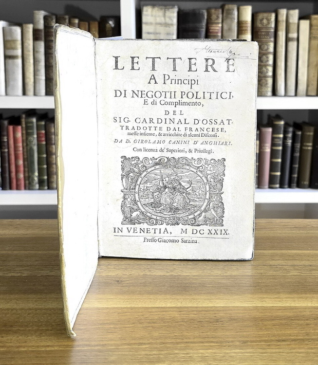 Tre parti (con autonomi frontespizi) in un volume di cm. 22, cc. (4) 98 (recte 102); (4) 92 (recte 96); (4) 100. Bellissimo marchio tipografico ripetuto ai tre frontespizi, numerose testatine, capilettera e finalini in xilografia. Bella legatura coeva in piena pergamena molle con titoli manoscritti al dorso. Tagli colorati. Antica firma di possesso a sguardia e frontespizio. Lieve e marginale alone alla parte alta delle ultime carte, qualche sporadica e modesta fioritura. Esemplare nel complesso genuino e ben conservato. Importante epistolario del celebre cardinale francese Arnaud d'Ossat (1536-1604). Allievo del Cuiacio a Bourges, d'Ossat ebbe modo di segnalarsi per il suo spirito diplomatico tanto da divenire il punto di riferimento della politica di Enrico IV in Italia. Di grande importanza, a proposito, furono le lunghe trattative con Clemente VIII per ricondurre il re nella comunione romana; il notevole spessore politico trapela anche da questa ricca raccolta di lettere che godette di grande prestigio e circolò in tutta Europa ricevendo numerose edizioni e traduzioni. Quella italiana venne compilata dal gesuita Girolamo Canini (1551-1631), nativo di Anghiari, autore di aforismi politici e di celebri traduzioni, fra cui spiccano queste lettere ed i Saggi di Montaigne. Rara prima edizione italiana. Cfr. Iccu; Piantanida, 26; Graesse, V, 59; non in Bozza e Brunet.