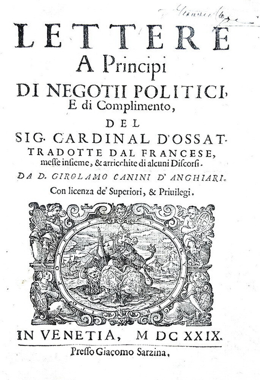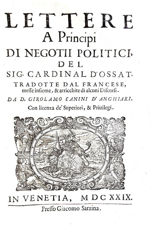 Lettere a prėncipi di negotii politici Divise in tre libri. Tradotte dal francese da D. Girolamo Canini d'Anghiari. In Venetia, presso Giacomo Sarzina, 1629.