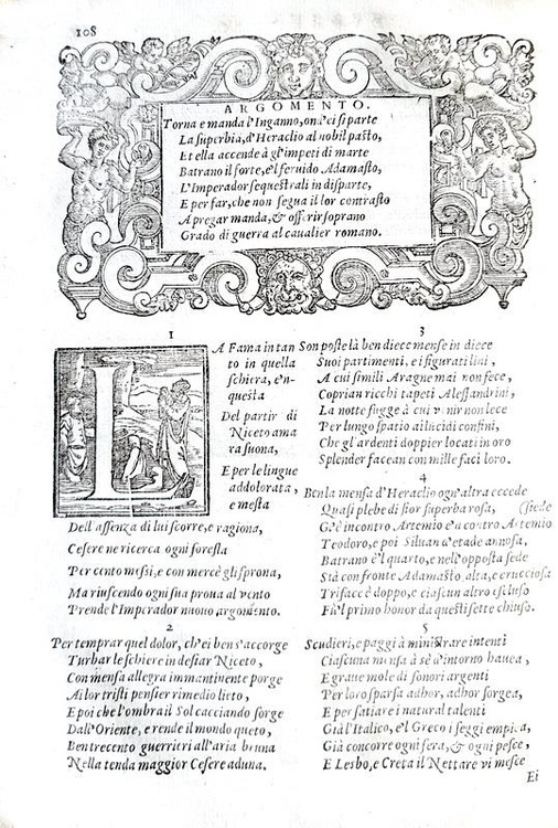 Cm. 23, pp. (8) 305 (1) [manca l'ultima carta bianca]. Bel marchio tipografico al frontespizio, numerosi capilettera e 35 belle testate xilografiche (a 1/3 di pagina) che incorniciano l'argomento di ciascun canto. Ottima legatura in pergamena rigida antica ben rimontata, titoli in oro su tassello al dorso. Piccole macchiette sparse (più evidenti al frontespizio), trascurabile strappetto restaurato (senza mancanza) all'ultima carta, peraltro esemplare nel complesso ben conservato. Francesco Bracciolini (1566-1645), poeta nativo di Pistoia, fu dapprima al seguito dei principi di Sulmona a Napoli, quindi per sei anni insieme al cardinale Federico Borromeo a Milano e infine segretario di Maffeo Barberini (che divenne papa Urbano VIII) a Roma e in Francia. Il celebre poema verte sul riacquisto, da parte dell'imperatore Eraclio, del legno della Croce caduto in mano ai Persiani. Prima edizione della stesura definitiva in trentacinque canti. Cfr. Piantanida, 2734; Gamba, 1818; Graesse, I, 517; Brunet, I, 1195, Olschki Choix, 18390; Iccu.