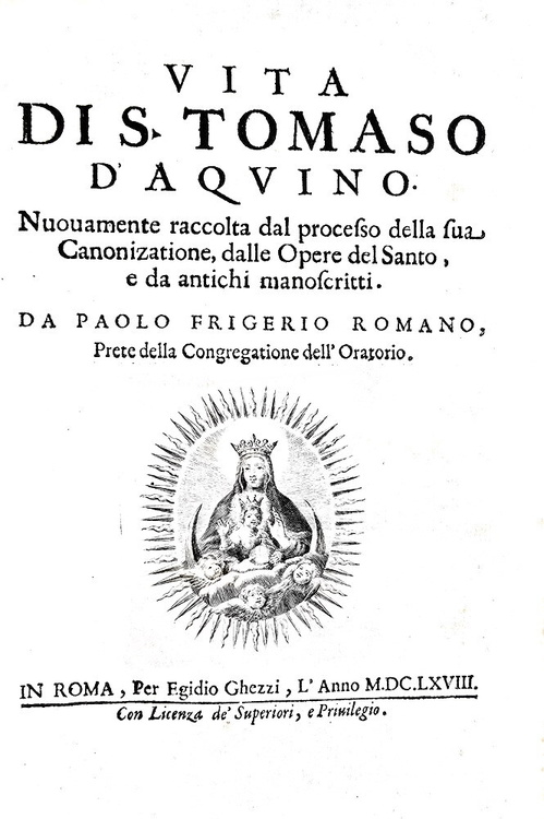 Vita di S. Tomaso d'Aquino. Nuovamente raccolta dal processo della sua canonizatione, dalle opere del santo, e da antichi manoscritti. Da Paolo Frigerio romano, prete della Congregatione dell'Oratorio. In Roma, per Egidio Ghezzi, 1668.