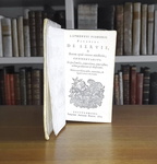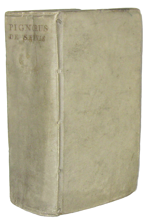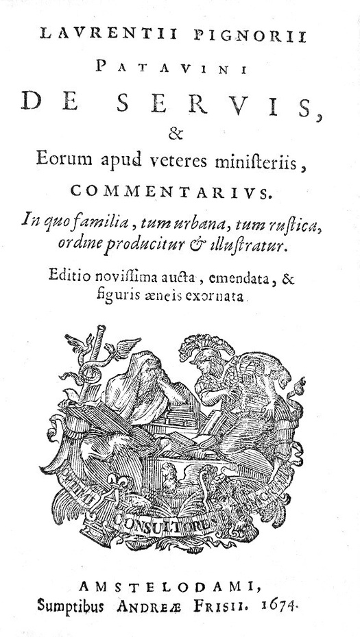 Pp. (36) 582 (38). Unito a: PHRISIUS TITUS P. De operis servorum liber. Stessi dati tipografici, ma 1672. Pp. 181 (9) + 1 c.b. Due distinte opere in un volume di cm. 13. Con una bella antiporta incisa in rame, decine di incisioni anche a piena pagina n.t. (talune xilografiche) e 15 tavole incise in rame fuori testo. Legatura strettamente coeva in piena pergamena rigida con titoli manoscritti al dorso e tagli spruzzati. Trascurabili e sporadici aloni. Esemplare ben conservato. Importante trattato dell'erudito padovano Lorenzo Pignoria (1571-1631 dedicato alla servitù, indagata secondo l'interpretazione classica, medievale e moderna. Ampia attenzione è rivolta ai principali strumenti utilizzati nella vita domestica. Edizione non comune e da preferirsi rispetto alle precedenti per completezza iconografica. Cfr. Pintanida, 4501: "terza edizione citata dal Fetis come la plus estimée"; Graesse, V, 290; Choix, 11257. La seconda opera, in prima edizione, è dedicata al medesimo tema.