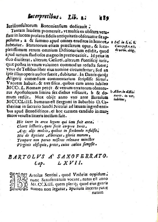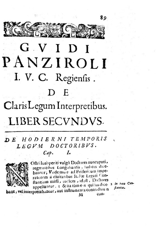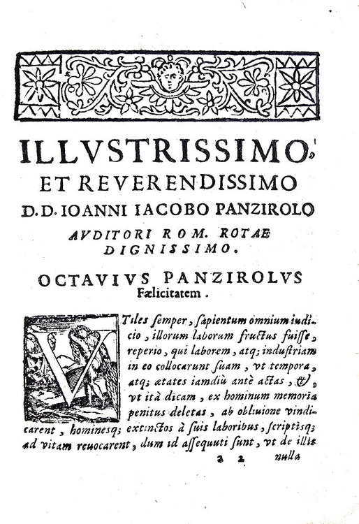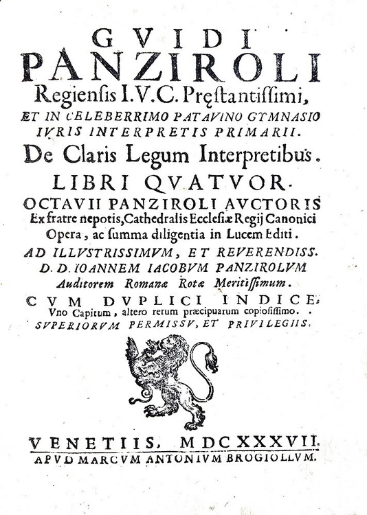 De claris legum interpretibus. Libri quatuor. Octauij Panziroli auctoris ex fratre nepotis, cathedralis Ecclesię Regij canonici opera, ac summa diligentia in lucem editi. Ad illustrissimum, et reuerendiss. D.D. Ioannem Iacobum Panzirolum ... Cum duplici indice, vno capitum, altero rerum pręcipuarum copiosissimo. Venetiis, apud Marcum Antonium Brogiollum, 1637.