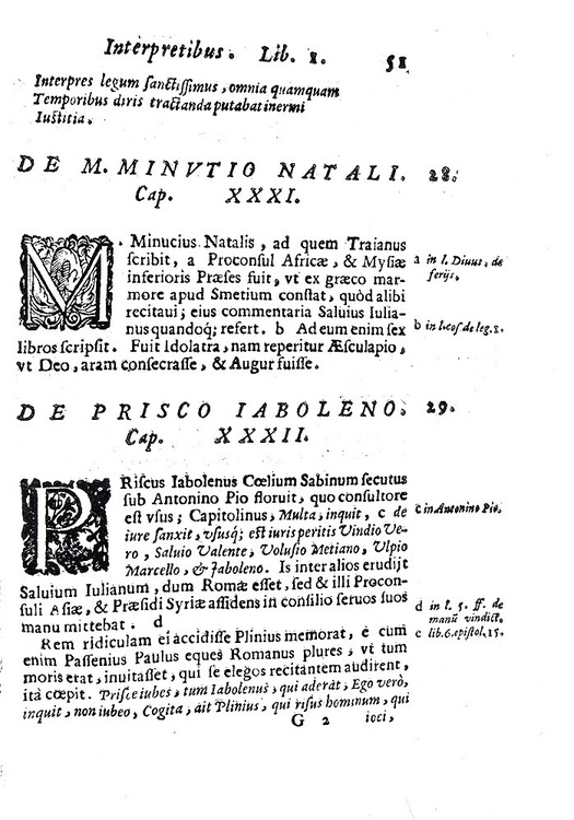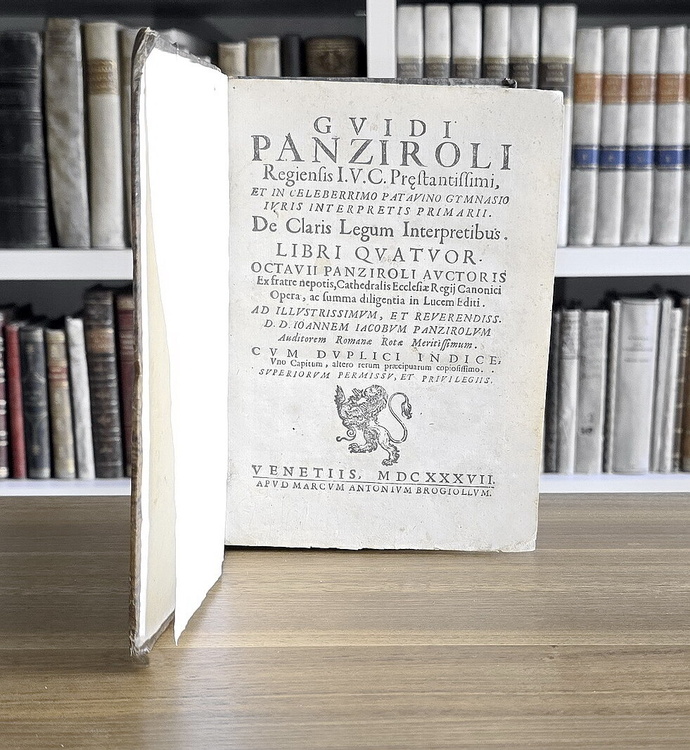 Cm. 20,5, pp. (16) 509 (53) + 1 carta bianca. Con vignetta al frontespizio, testatine e centinaia di capilettera xilografici ad adornare ogni capitolo. Legatura settecentesca in mezza pelle con titoli e ricchi fregi in oro al dorso, carta decorata ai piatti. Lievi segni del tempo alla legatura con due piccole mancanze agli angoli delle cerniere anteriori e una sottile screpolatura verticale nella parte centrale del dorso (senza mancanza di pelle). Sporadiche macchiette perlopiù marginali e minime tracce di polvere limitate all'angolo di poche carte. Esemplare nel complesso genuino e in buono stato di conservazione. Guido Panciroli, latinizzato come Guidus Panzirolus o Pancirolus (Reggio Emili 1523 – Padova 1599) è fu giurista, storico e antiquario. Studiò giurisprudenza a Ferrara, a Bologna, a Padova, dove si laureò in utroque iure il 25 ottobre 1547; ma, già prima della laurea, insegnava istituzioni di diritto romano. Dopo la partenza di Matteo Gribaldi Moffa, gli succedette in una delle cattedre di diritto civile. La sua fama attirò a Padova studenti da tutta Europa. Lasciò Padova nel 1570 per succedere, nell'Università di Torino, ad Aimone Cravetta. Tornò a Padova nel 1572: ammalatosi agli occhi, per quanto chiamato a Roma, quale consultore, da due papi, non volle più lasciarla. Il De claris legum interpretibus fu pubblicato postumo dopo la morte dell'autore dallo zio paterno Ottavio. Nell'opera Panciroli tratta dei giureconsulti romani, della costituzione delle università, dei civilisti e canonisti del Medioevo e dei vescovi giuristi. Rarissima e ricercata prima edizione, stampata postuma. Cfr. Iccu; non in Brunet (IV, 339) e Graesse (V, 118) che menzionano solo edizioni posteriori.