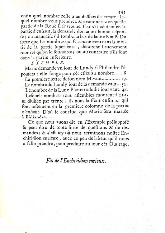 Cm. 22,5, pp. (16) 343 (1). Con due tavole ripiegate f.t. raffiguranti Apollo sul carro e prospetti di geomanzia; decine di bellissime illustrazioni calcografiche e xilografiche raffiguranti segni della mano, rughe del viso, figure geomantiche e più in generale disegni di taglio astrologico (mani chiromantiche, calcoli astrologici, numerosi volti umani a piena pagina, sfera, influenza dei pianeti, Ruota di Pitagora). Ottima legatura posteriore in piena pelle; dorso a 5 nervi con titoli in oro su tassello in pelle. Segnacolo in seta multicolore rinnovato. Antiche note di possesso al frontespizio. Leggere e unformi bruniture dovute alla qualità della carta, qualche sporadica macchietta/alone, minimo restauro all'angolo bianco alto del frontespizio. Esemplare caratterizzato da carte un po' vissute ma complessivamente in buono stato di conservazione. Quarta edizione di questo rarissimo ed "eccellente trattato sulle arti divinatorie" (Caillet), presentato alla censura reale sotto il titolo di "Enchiridion curioso" e che apparve per la prima volta a Parigi nel 1656. Così Cantamessa, Astrologia. Opere a stampa, Olschki, 1007 (II, 3422): “È un trattato di Sciences curieuses: in effetti, l'Autore, di cui si conosce solo il cognome (?), scrive di chiromanzia (i primi 10 capitoli), di fisiognomica (19 capitoli), di geomanzia (21 capitoli). L'astrologia attraversa l'opera, quale, sostanzialmente, minimo comun denominatore delle altre tre scienze, se così si possono chiamare. Peruchio tratta in modo superficiale delle caratteristiche dei Pianeti e dei Segni (si vedano le pagine 102-123 e le relative tavole dei gradi nella parte dedicata alla chiromanzia, nonché, nella parte dedicata alla geomanziam in particolare le pagine da 197 a 204). Alla pagina 204 è riprodotta una bella tavola che ha quale tema il quesito relativo all'effettiva celebrazione di un matrimoniom i cui simboli vengono riprodotti nelle tavole, alcune di esse davvero belle, che arricchiscono l'opera. Le pagine da 328 a 339 si occupano di numerologia (per esempio, per stabilire se una persona è colpevole o meno di un reato) e, infine, le ultime 3 spiegano come si usa la Ruota di Pitagora, mirabilmente riprodotta”. Cfr. anche Iccu; Caillet III, 8555; Dorbon 3623; Graesse, V, 106.