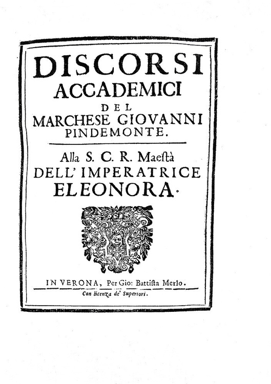Discorsi accademici … Alla S.C.R. maestà dell'imperatrice Eleonora. In Verona, per Gio. Battista Merlo, (1674).