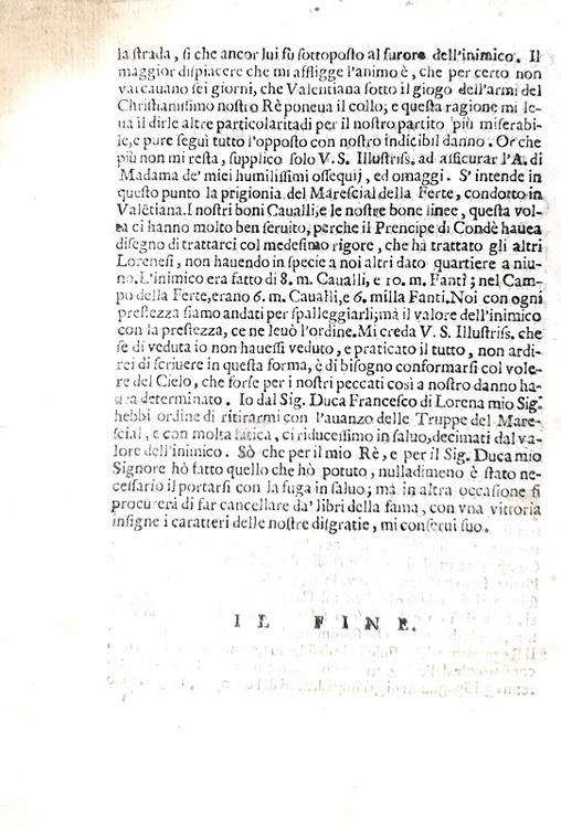 Cm 20, pp. (8). Brossura antica (ma posteriore) muta. Alone limitato all'angolo alto degli ultimi due fogli, peraltro esemplare nel complesso ben conservato. La battaglia di Valenciennes (16 Luglio 1656) fu combattuta tra le truppe spagnole comandate da Don Giovanni d'Austria il giovane contro le truppe francesi del maresciallo Turenne nel contesto della guerra franco-spagnola. La battaglia, una delle poche sconfitte subite dal Visconte di Turenne, è considerata dalla storiografia come l'ultima grande vittoria che portò al declino della potenza militare spagnola. Rarissima prima edizione (non censita in Iccu) della relazione bellica, stampata nel medesimo anno degli eventi.