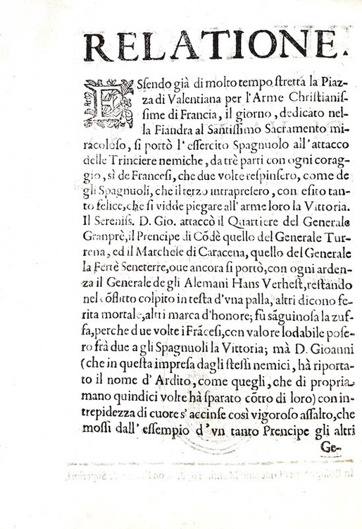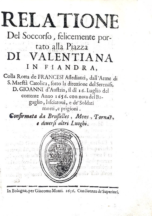 Relatione del soccorso, felicemente portato alla Piazza di Valentiana in Fiandra, colla rotta de francesi assedianti, dall'arme di S.M. catolica, sotto la direttione del Sereniss. D. Gioanni d'Austria, il dì 16 Luglio del corrente anno 1656. Con nota del bagaglio, lasciatovi, e de' soldati morti, e prigioni. Confirmata da Brusselles, Mons, Tornay, e diversi altri luoghi. In Bologna, per Giacomo Monti, 1656.