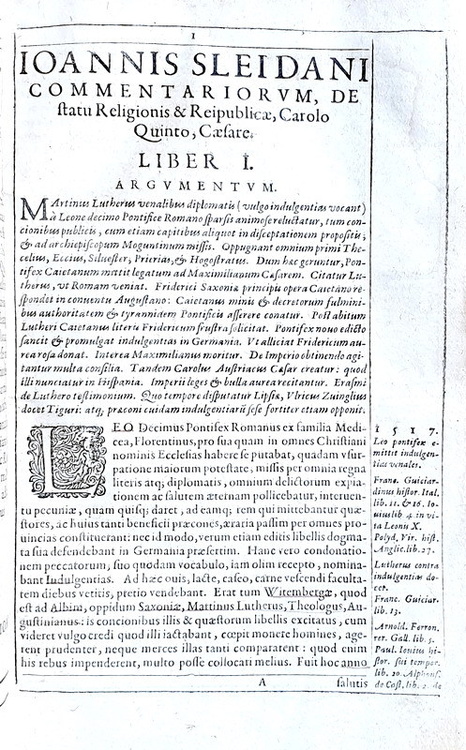 Cm. 19, pp. (8) 805 (19). Bel frontespizio inciso finemente in rame. Bella legatura in piena pergamena con piccole unghie; traccia di titoli ms. e molteplici filetti impressi a secco al dorso. Qualche segno di tarlo all'interno dei piatti e sporadici forellini che non ledono il testo. Lievi bruniture dovute alla qualità della carta, qualche trascurabile alone. Esemplare nel complesso ben conservato. Celebre opera di storia della riforma di Johannes Sleidanus (1506-1556). L'Autore, ritenuto uno dei più grandi storici tedeschi, ebbe atteggiamenti critici verso Carlo V che, non a torto, lo considerava un avversario. Quest'opera ebbe una gran diffusione tanto che venne tradotta in tedesco, francese ed italiano e subì numerose contraffazioni editoriali.