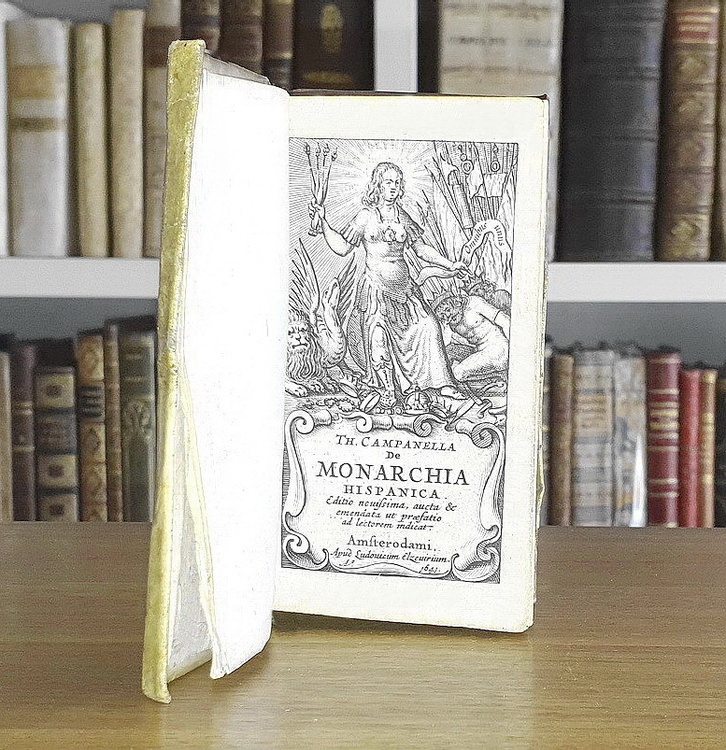 Cm. 11, pp. (8) 379 [recte 376]. Bellissimo frontespizio finemente inciso in rame. Bella legatura strettamente coeva in piena pergamena rigida con unghie. Trascurabile alone limitato al margine superiore bianco di alcune carte, sporadiche arrossature. Esemplare nel complesso genuino e ben conservato. Nel trattato De monarchia hispanica il grande filosofo calabrese Tommaso Campanella (1568-1639) teorizzò una monarchia cristiana universale, guidata dal papato e dal re di Spagna. A differenza del pensiero politico machiavelliano, più pragmatico e improntato alle strategie di consolidamento del potere, gli obiettivi di Campanella erano finalizzati utopicamente a raggiungere una comunità felice e unita spiritualmente. Cercò di persuadere i monarchi spagnoli a trasformare i loro regni in un tipo completamente diverso di società, invitandoli alla prudenza e ad adempiere al ruolo che Dio aveva assegnato alla Spagna. Rara seconda edizione elzeviriana in latino (la prima prima assoluta, in lingua tedesca, uscì postuma alla morte dell'Autore nel 1620). Cfr. Willems, 971: “Reimpression olus correcte de l'edition parue l'annee precedente”; Graesse II, p. 28; Iccu; non in Olschki-Choix e Piantanida.