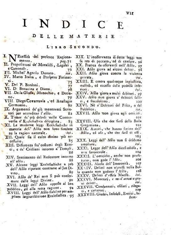 Cm. 24, pp. viii, 119 (1). Bellissima vignetta incisa in rame al frontespizio; testatine e bei finalini xilografici. Legatura strettamente coeva in cartonato alla rustica con nervi passanti e titoli manoscritti al dorso. Minimi segni del tempo alla legatura, arrossature/fioriture sparse, strappetto (che non interessa il testo) all'angolo alto dell'ultima carta, peraltro nel complesso buon esemplare, ancora in barbe. Francesco d'Aguirre (1682-1753), intellettuale e giurista originario di Salemi, fu tra i principali artefici della riforma e modernizzazione dell'Università di Torino, tanto che il suo schema operativo fu utilizzato da Napoleone per la riforma della Sorbona di parigi. Questo interessantissimo trattato sul diritto d'asilo fu pubblicato postumo grazie alle cure del giurista fiorentino Pompeo Neri (1706-1776), considerato tra i principali artefici delle politiche riformiste degli Asburgo-Lorena, sovrani del Granducato di Toscana. Rara prima edizione. Cfr. Iccu; Edizioni giuridiche antiche in lingua italiana, II,2, p. 621; Melzi, I, 311; Parenti, p. 89; Venturi, II, p. 107.