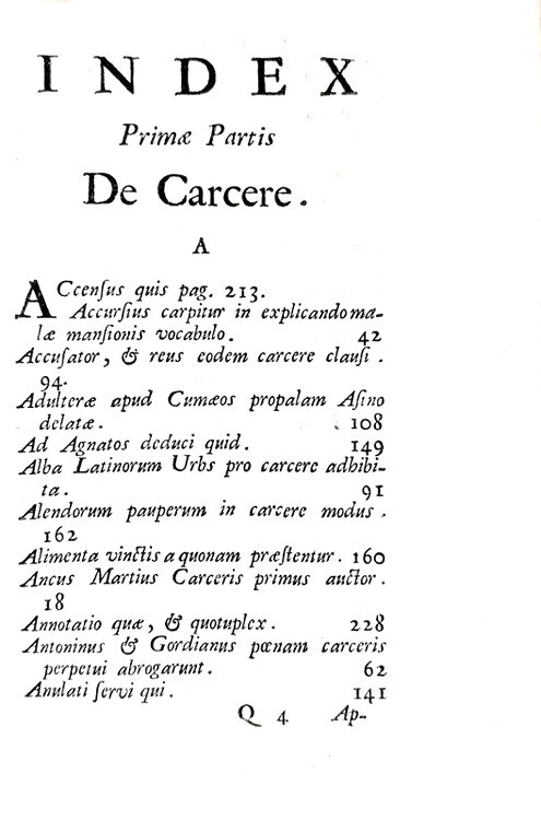 De carcere, et antiquo ejus usu ad haec usque tempora deducto tractatus in duas partes distributus, quarum altera historiam carceris, altera praxim complectitur. Auctore Antonio Bombardino patavino in patrio lyceo rerum criminalium interprete. Pars prima [unica pubblicata!]. Patavii, typis. Sem. apud Joannem Manfrè, 1713.