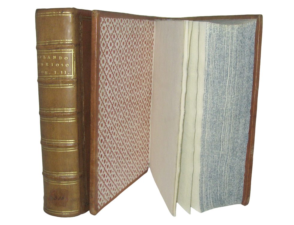 Quattro parti in due grossi volumi di cm. 28,5, pp. (16) lx, cc. (150); (214); (206); (268). Con 62 magnifiche tavole incise finemente in rame, questo il dettaglio: 4 frontespizi, 1 antiporta illustrata, 1 ritratto dell'Autore, 5 tavole a corredo della Vita di Ariosto, 51 tavole calcografiche poste all'inizio di ogni canto. Le incisioni furono realizzate da Zuliani, Fambrini, Daniotto, Leonardis e altri, su disegni di P.A. Novelli. Il testo è impreziosito da moltissime testate e cul-de-lamp, il tutto sempre inciso finemente in rame. Bellissima legatura coeva in pieno vitello con duplice filetto dorato al contorno dei piatti e dorsi a cinque nervi sottolineati da duplici filetti dorati. Titolo e numerazione dei tomi alla seconda casella riquadrata da un duplice filetto dorato; tagli spruzzati di colore azzurro. Contropiatti rivestiti di carta decorata di colore rosa. Il primo proprietario, quindi anticamente, fece aggiungere in fine ciascun canto due fogli bianchi di carta della medesima qualità per eventuali annotazioni, ma rimasti bianchi. Qualche piccola abrasione/spellatura superficiale alla legatura. Splendido esemplare da alta collezione, in ottimo stato di conservazione e caratterizzato da una non comune freschezza delle carte. Il celebre poema ariostesco è suddiviso in quarantasei canti con i famosi cinque aggiunti successivamente, seguiti da una o più pagine di annotazioni esegetico-esplicative. Ogni canto presenta un argomento iniziale stampato entro piccole bordure ed una tavola calcografica (pure entro contorno) che ne raffigura il tema centrale. Questa raffinatissima edizione si caratterizza come uno dei capolavori dell'editoria veneziana del Settecento ed in assoluto è una delle più celebri edizioni antiche dell'Orlando furioso. L'opera, considerata un libro d'arte, fu realizzata da Antonio Zatta, uno dei più importanti editori di libri figurati della storia. Cfr. Iccu; Gamba, 61; Morazzoni, p. 57; Agnelli-Ravegnani, p. 202-203; Graesse, I, 199, "Cette édition enrichie de notes a été faite sur la dernière réimpression de Pitteri”; Brunet, I, 437.