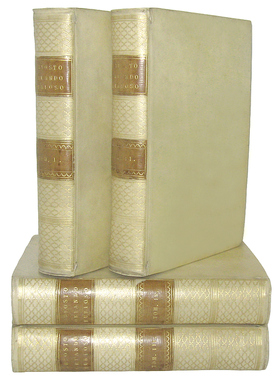 Quattro volumi di cm. 21, pp. lxxxix (1), 360; 452; 448; 452. Antiporta illustrata con il ritratto dell'Ariosto e 92 belle tavole fuori testo incise finemente in rame. Bellissima legatura coeva in piena pergamena rigida con titoli su doppio tassello in pelle e ricche dorature al dorso liscio. Tagli di piede ed esterno gialli. Al contropiatto anteriore ex-libris araldico inciso in rame di inizi Ottocento "Edward Knight", che ha apposto la sua firma di possesso sul frontespizio dei volumi (Edward Knight 1819). Lievi e sporadiche arrossature, leggermente più marcate in poche carte. Bell'esemplare, nel complesso fresco e ben conservato. Pregevole e raffinata edizione parigina dell'Orlando furioso con 92 illustrazioni a piena pagina, disegnate e incise da diversi artisti tra i più rappresentativi del tempo (Cochin, Monnet, Cipriani, Eisen, Moreau le jeune, ecc.). Le illustrazioni, in parte tratte dall'edizione di Baskerville del 1773 e altre di Cochin tratte dall'edizione in francese del 1775-83, offrono nel loro insieme un significativo panorama dell'arte del libro figurato del secondo Settecento in Francia. Le pagine preliminari contengono l'ampia biografia del poeta scritta dal ferrarese Giovanni Andrea Barotti, e gli "Avvertimenti di Geronimo Ruscelli per intelligenza di questo poema". Cfr. Agnelli-Ravegnani, 211; Graesse, I, 200; Brunet, I, 438; Cohen de Ricci, 95f.