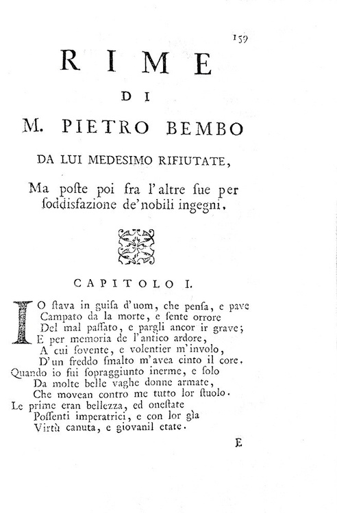 Rime di m. Pietro Bembo corrette, illustrate, ed accresciute come dalla prefazione si puņ vedere. S'aggiungono le poesie latine, e la vita dell'autore descritta da Tommaso Porcacchi di varie annotazioni novellamente illustrata. In Bergamo, appresso Pietro Lancellotti, 1745.