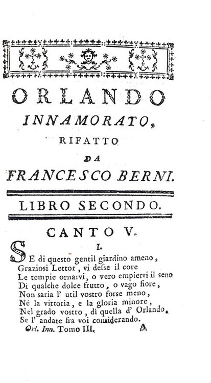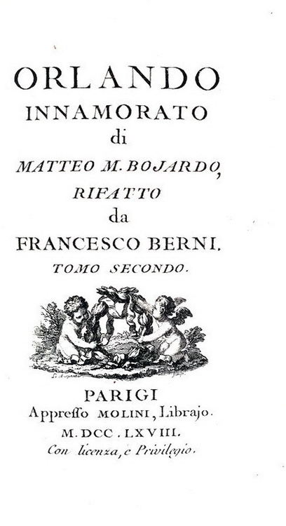 Orlando innamorato, rifatto da Francesco Berni. Parigi, appresso Molini librajo, 1768.
