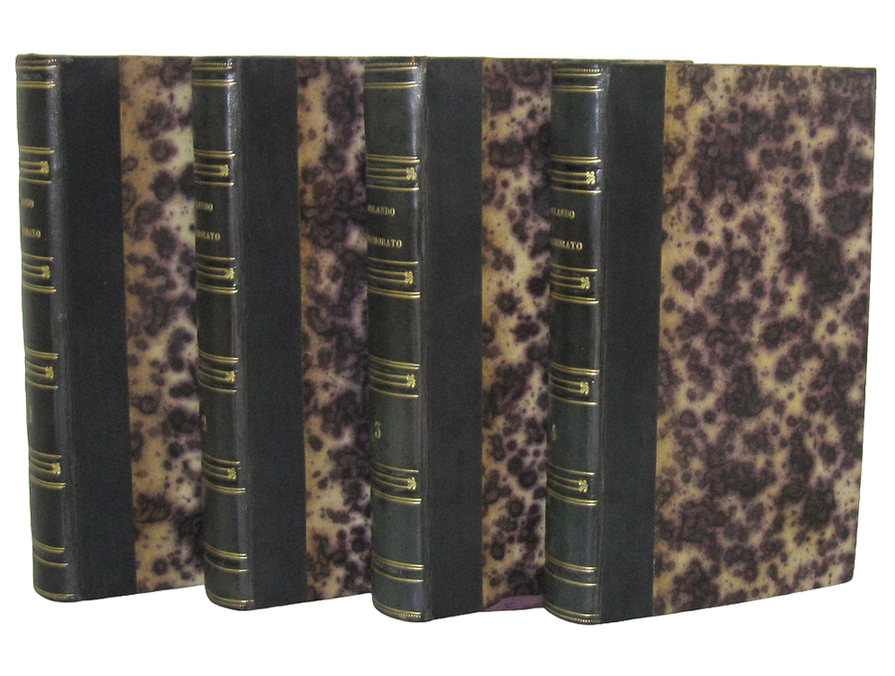 Quattro volumi di cm. 15,5 pp.(2) iv, 395 (1); (2) 409 (1); (2) 410; (2) 396. Con un bellissimo ritratto di Berni inciso all’antiporta del primo volume e protetto da velina. Fregi a fine capitoli e testatine in xilografia. Graziosa vignetta ai quattro frontespizi incisi integralmente in rame. Pregevole legatura ottocentesca francese in mezzo marocchino con titoli e molteplici filetti in oro al dorso. Carta decorata ai piatti e tagli spruzzati. Segnacolo in seta viola. Bellissimo esemplare da alta collezione, in perfetto stato di conservazione e caratterizzato da una non comune freschezza delle carte. Raffinata e ricercata edizione (assai curata nel testo e nell'impressione tipografica) di questo celebre romanzo di cavalleria di Matteo Boiardo (1434 - 1494) la cui prima edizione, conosciuta in unico esemplare, risale al 1486. L'Orlando Inammorato fu in seguito aumentato ed emendato da Francesco Berni nella prima metà del Cinquecento e infine rivisto da Nicolò degli Agostini e da Lodovico Domenichi. Cfr. Iccu; Brunet I, 1052; Gamba, 163.