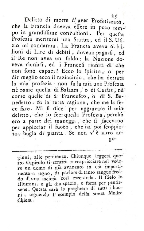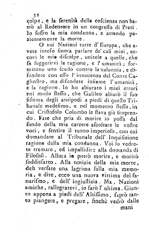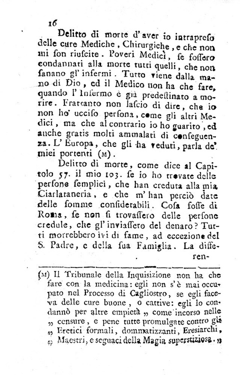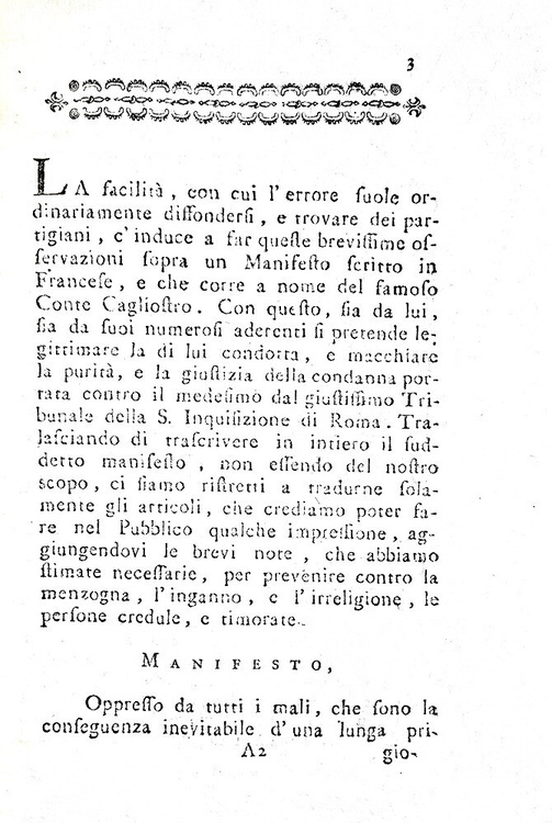 Manifesto di Giuseppe Balsamo denominato il conte Cagliostro o sue difese contro il di lui processo formato dalla S. Inquisizione di Roma. Traduzione dal francese a cui si appongono alcune note, e osservazioni del traduttore, le quali rilevano l'assurdita delle difese medesime, e l'integrita, e giustizia del processo, e sentenza emanata in Roma l'anno 1790. S.n.t. (ma circa 1790).