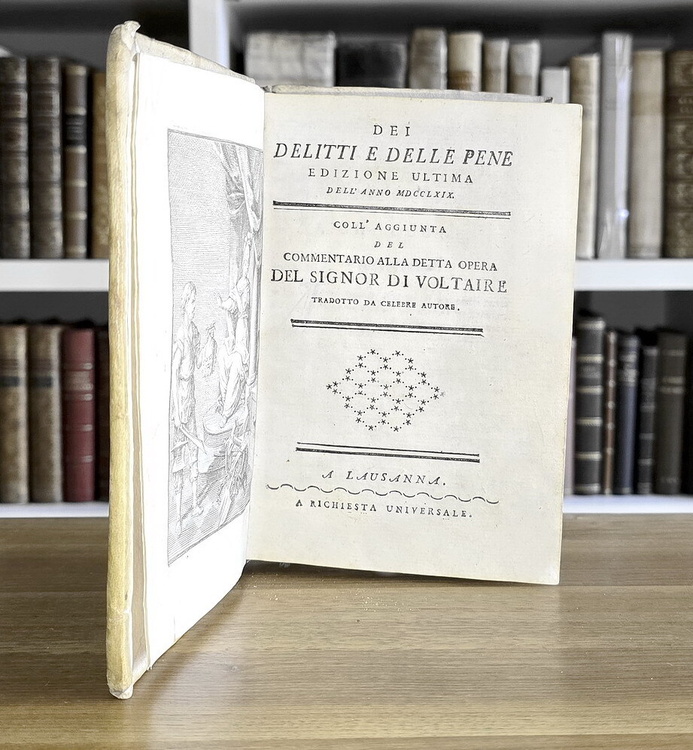 Cm. 17, pp. vii (1) 174 (2). Bellissima antiporta allegorica incisa finemente in rame. Legatura strettamente coeva in piena pergamena rigida con titoli in oro al dorso. Qualche sporadica macchietta/fioritura. Esemplare nel complesso ben conservato. Questa celebre opera, vero e proprio simbolo dell'Illuminismo italiano, fu pubblicata anonima nel 1764 a Livorno da Marco Coltellini. Nel saggio Cesare Beccaria (1738-1794) si pone con spirito illuminista delle domande circa le modalità di accertamento dei delitti e circa le pene allora in uso. Nel 1766 il libro viene incluso nell'indice dei libri proibiti a causa della sua distinzione tra reato e peccato. Così scrisse Pietro Verri, a proposito dell'opera, in una lettera ad amici milanesi: «Prima di chiudere vi soddisferò sul proposito del libro Dei delitti e delle pene. Il libro è del marchese Beccaria. L'argomento gliel'ho dato io, e la maggior parte dei pensieri è il risultato delle conversazioni che giornalmente si tenevano fra Beccaria, Alessandro, Lambertenghi e me. […] Beccaria si annoiava e annoiava gli altri. Per disperazione mi chiese un tema, io gli suggerii questo, conoscendo che per un uomo eloquente e d'imagini vivacissime era adattato appunto. Ma egli nulla sapeva dei nostri metodi criminali. Alessandro, che fu il protettore dei carcerati, gli promise assistenza. Cominciò Beccaria a scrivere su dei pezzi di carta staccati delle idee, lo secondammo con entusiasmo, lo fomentammo tanto che scrisse una gran folla d'idee, il dopo pranzo si andava al passeggio, si parlava degli errori della giurisprudenza criminale, s'entrava in dispute, in questioni, e la sera egli scriveva; ma è tanto laborioso per lui lo scrivere, e gli costa tale sforzo che dopo un'ora cade e non può reggere. Ammassato che ebbe il materiale, io lo scrissi e si diede un ordine, e si formò un libro». Importante e rara edizione che raccoglie oltre al testo rivisitato e definitivo del capolavoro di Beccaria anche la prima edizione italiana del Commentario di Voltaire. Il luogo di stampa Losanna è falso, in realtà la presente edizione fu stampata a Livorno da Marco Coltellini (a questo proposito si veda Luigi Firpo, Le edizioni italiane del "Dei delitti e delle pene", p. 572-573, nr. 14). Cfr. Iccu; Bibliografia delle Edizioni giuridiche antiche, II, 2, 723.