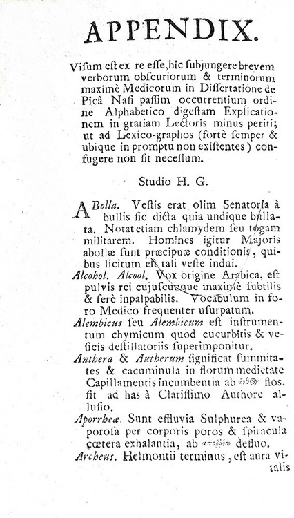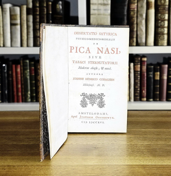 Cm. 16, pp. (20) 177 (11). Bellissima antiporta incisa finemente in rame, frontespizio in rosso e nero. Legatura ottocentesca in mezza pelle con punte; dorso a 4 nervi con titoli in oro e tagli marmorizzati. Trascurabili segni del tempo alla legatura, lievi e sporadiche fioriture. Esemplare nel complesso in buono stato di conservazione. Johann Heinrich Cohausen (1665-1750) fu medico a Munster e lasciò scritti spesso critici e umoristici nei confronti dei suoi contemporanei. Opera satirica sull' uso e sull'abuso del tabacco da fiuto che in quegli anni era diventato assai diffuso in tutta Europa. Nella narrazione Apollo ordinò a Mercurio di confiscare i nasi degli sniffatori di tabacco e quando vennero restituiti, le vittime afferrarono i nasi sbagliati e divennero irriconoscibili. "The author emphatises the opinion widely held by contemporary physicians and by moralists, that tobacco-smuffing was essentially a kind of morbid appetite." (Arents, 504). Rara prima edizione. Cfr. anche Hirsch II, 48; Brunet, II, 124; Graesse, II, 210; Iccu.