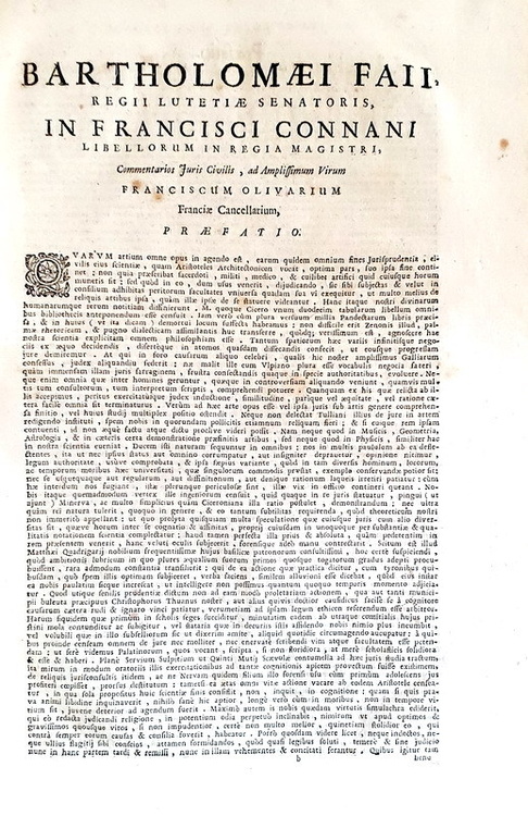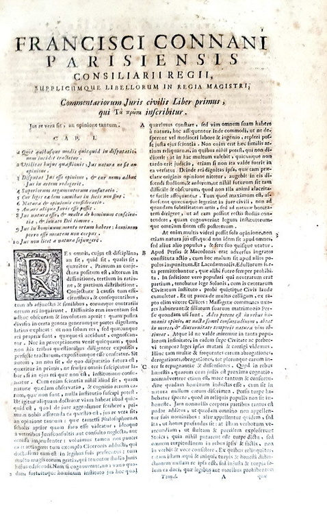 Due volumi di cm. 37,5, pp. (36) 374; (18) 400. Frontespizi in rosso e nero. Legatura coeva in piena pergamena rigida con titoli in oro al dorso; tagli spruzzati. Fioriture e bruniture naturali, tipiche della carta napoletana del tempo, trascurabili mancanze al margine inferiore bianco delle ultime 3 carte del primo volume, peraltro esemplare ben conservato. Francois Connan (1508-1551), studiò con Alciato a Bourges e partecipò all'affermazione del cosiddetto Mos gallicus. Quest'importante commentario di diritto romano ben definisce gli orientamenti dottrinali dell'umanesimo giuridico, rimarcando una netta distanza da Bartolo e dalla scuola dei commentatori tardo-medievali. Connan fu il primo giureconsulto a cercare una razionalizzazione e una sistemazione razionale dell'universo del diritto civile secondo le nuove istanze umanistiche. I commentari, stampati per la prima volta postumi nel 1553 furono implementati e completati proprio nel 1557 da Francois Hotman. Cfr. Iccu; Sapori, 708.